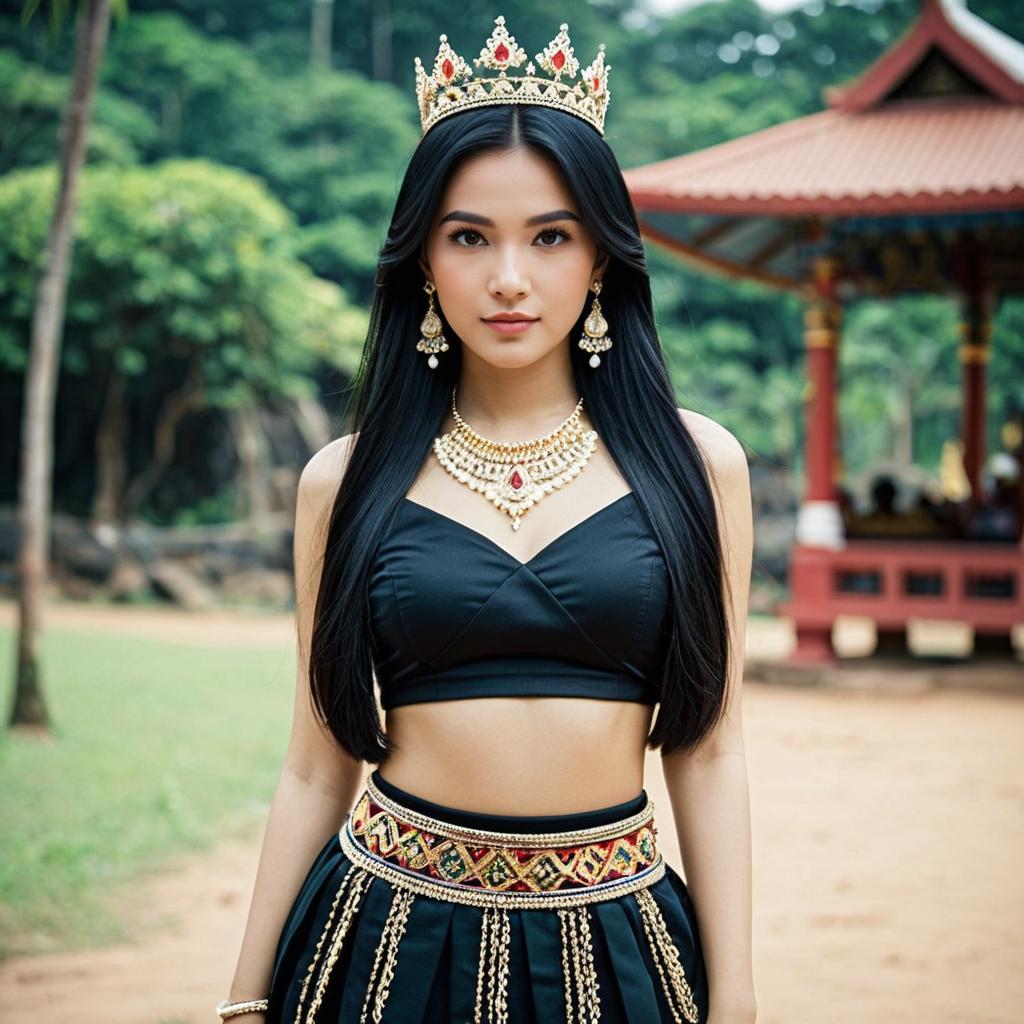 Portrait of a young Asian woman wearing a traditional Thai princess costume outdoors. She has long black hair and is dressed in a black crop top and matching skirt adorned with intricate gold and colorful embellishments. She wears a golden jeweled crown, earrings, and necklace with red accents. The background features a blurred outdoor setting with greenery and traditional Thai architecture.
