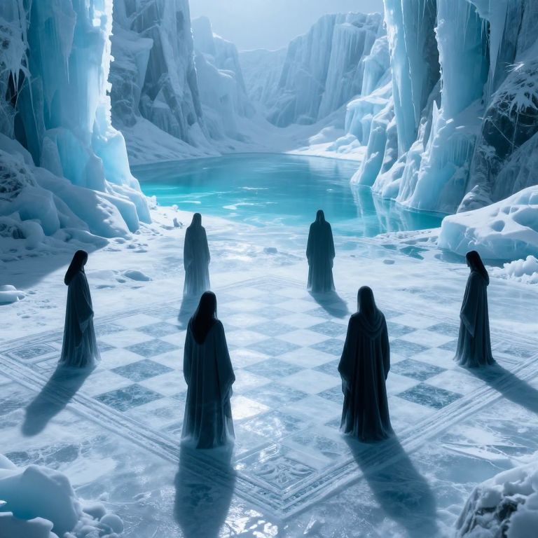 Ghostly figures in dark robes stand solemnly on a colossal chessboard carved into a frozen landscape, surrounded by towering ice cliffs and a serene turquoise pool, as their silent presence casts long shadows across the icy terrain.