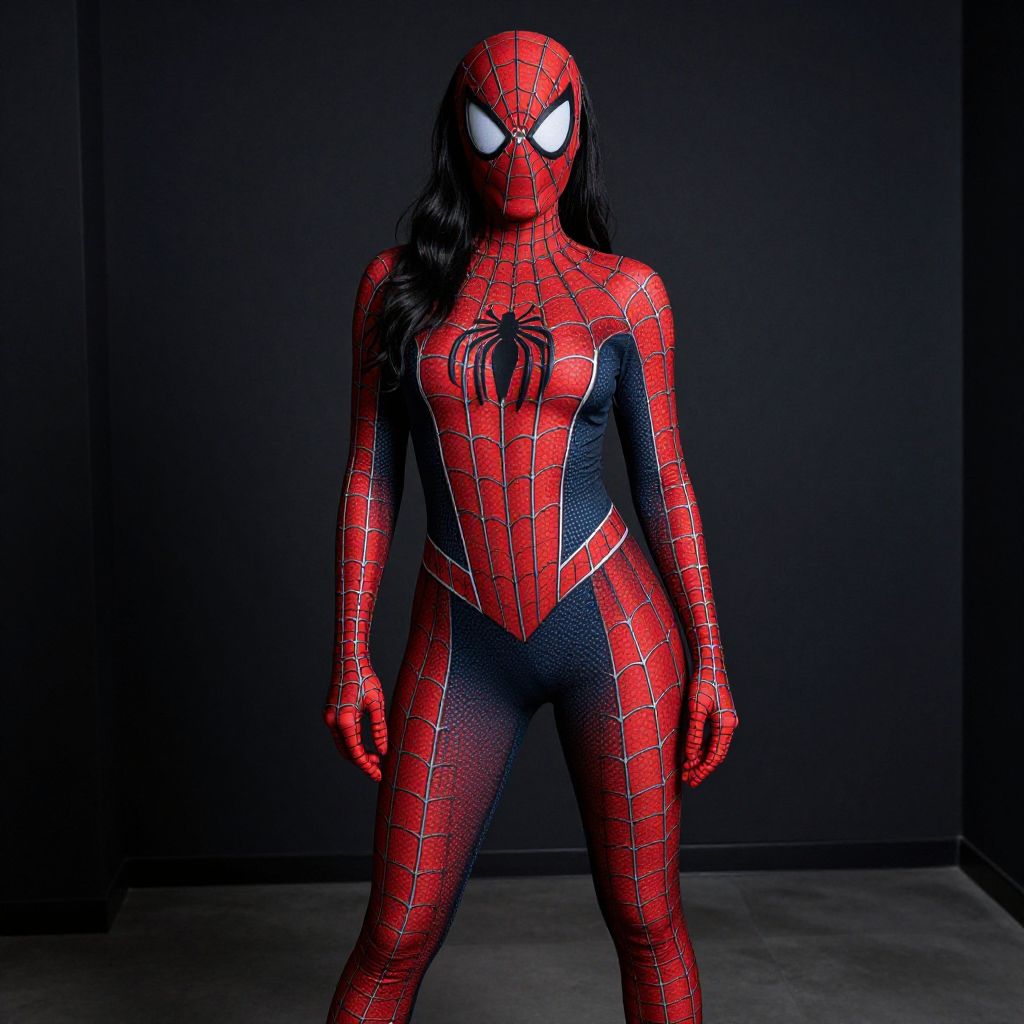"Spider Man Halloween Costume Woman, a woman in a spider - man suit poses for a photo"