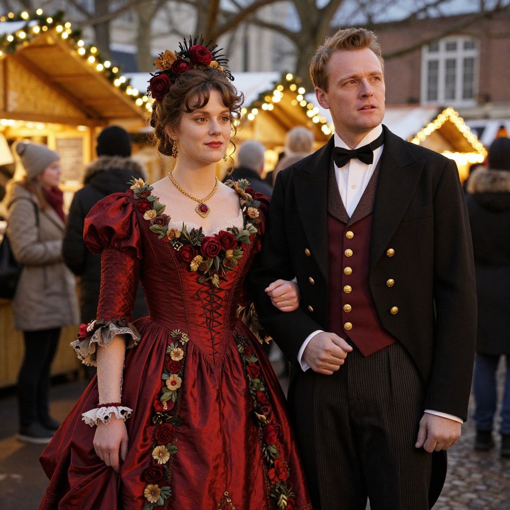 A Victorian couple dressed in elegant attire, featuring a woman in a rich red gown adorned with floral accents and a man in a formal black suit with gold buttons and a bow tie, stands amidst the warm, golden glow of festive lights at the Georgetown Christmas Market, capturing a nostalgic and high-definition holiday scene.