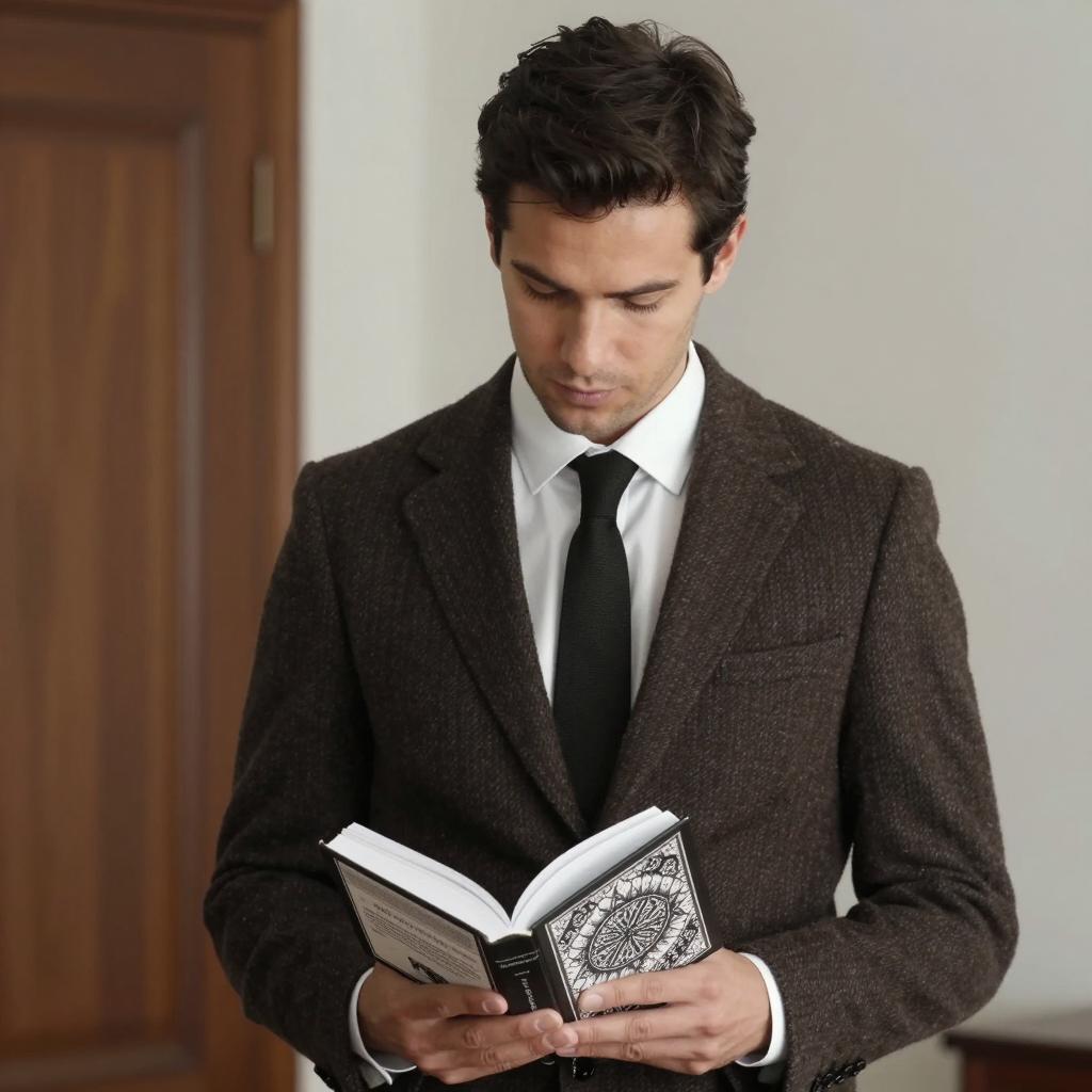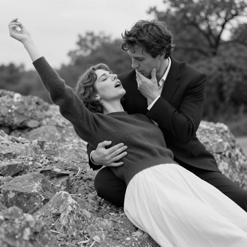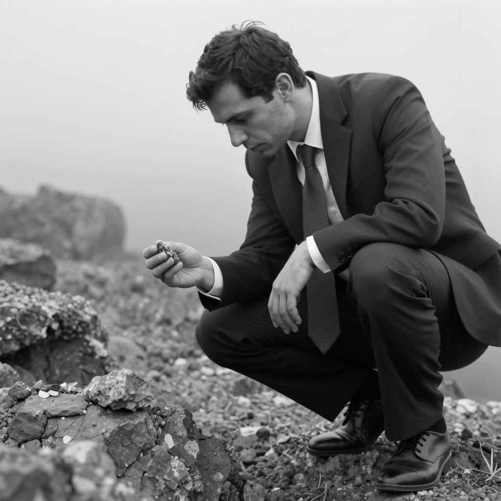 Black-and-white photograph of a man in a suit and tie, squatting on rocky terrain, holding a small rock with his right hand. Man has short dark hair, slightly bent forward, looking at rock. Background has misty, rocky landscape. Man's left hand rests on his knee. Monochrome, high contrast.