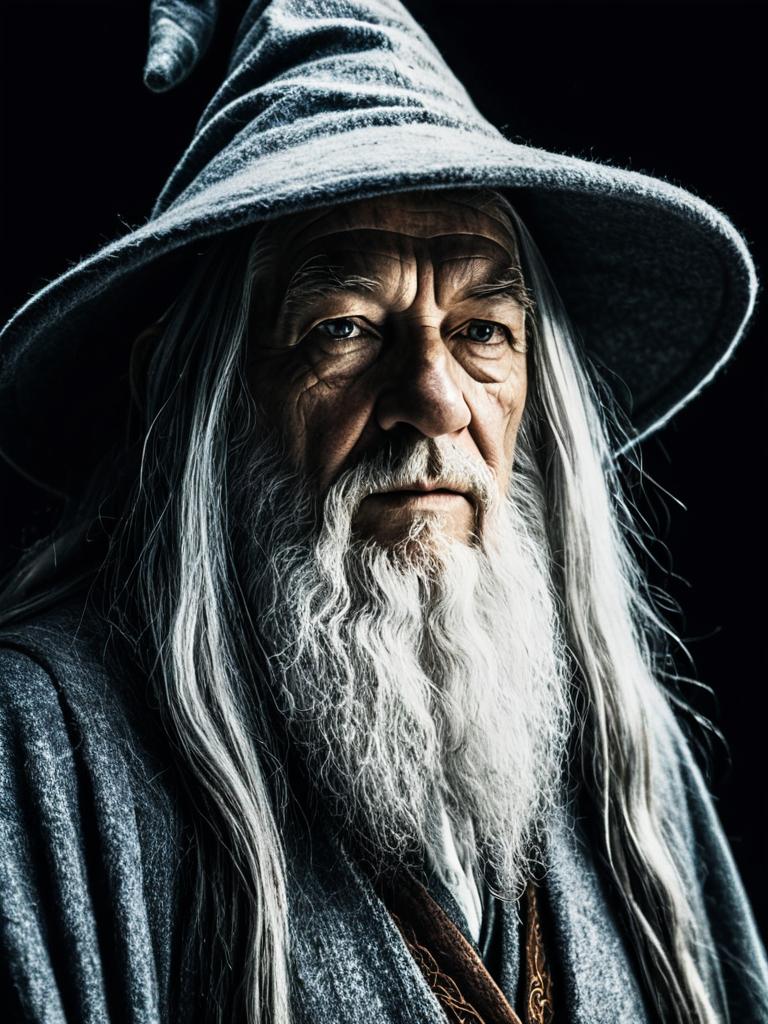 Man in Gandalf costume, photorealistic dramatic wizard portrait, cinematic realism