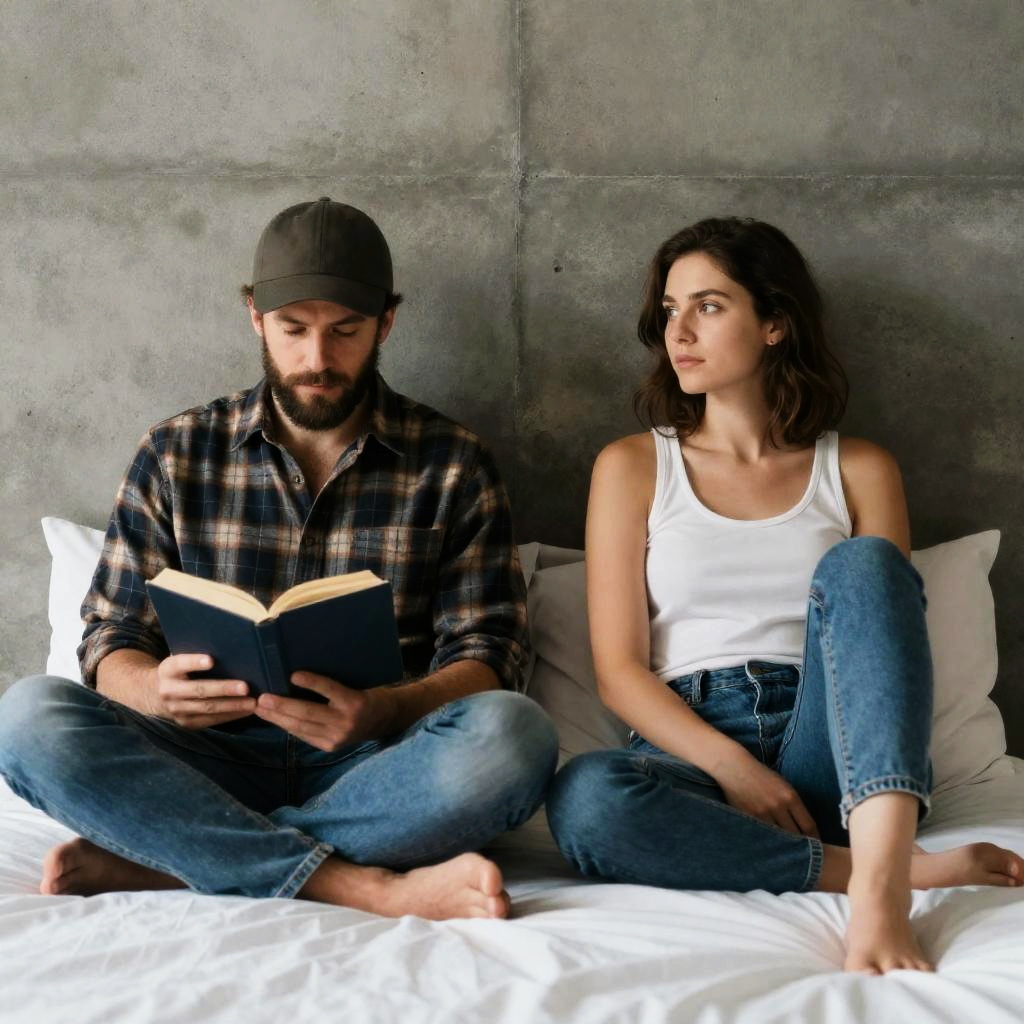 Photograph of two people sitting against a gray concrete wall. Bearded man with brown hair, wearing a beige cap and plaid shirt, holding a magazine. Brown-haired woman in a beige tank top, looking serious. Both with crossed legs, man on left, woman on right. Man reading, woman looking forward.