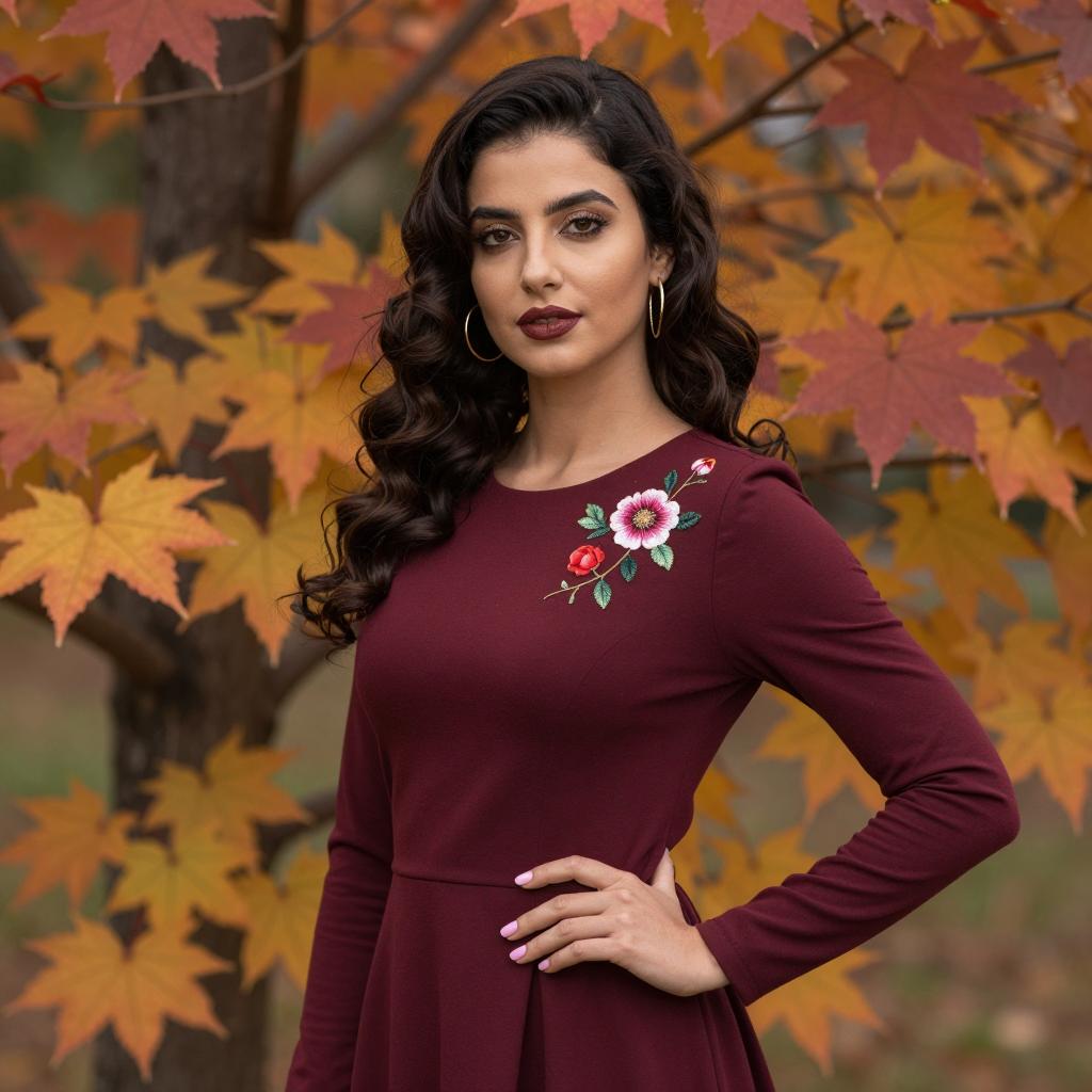 A captivating portrait of a woman in a rich burgundy dress, adorned with floral embroidery, surrounded by vibrant autumn foliage. The warm colors of the leaves create a stunning backdrop, enhancing her elegant features and confident demeanor.