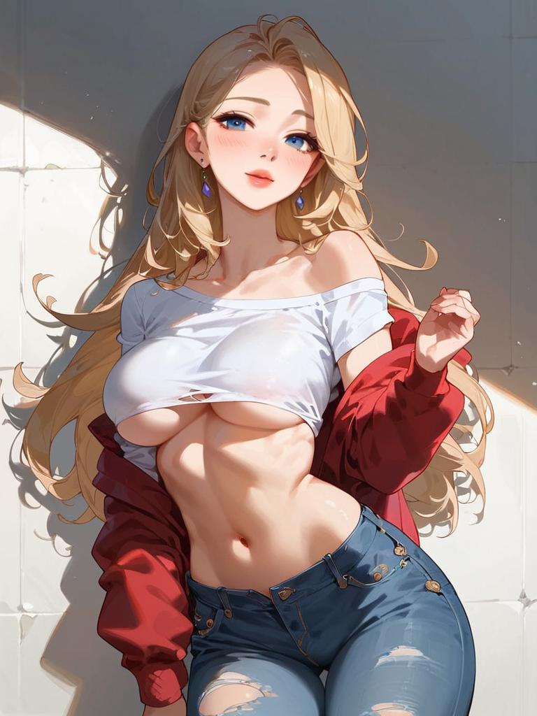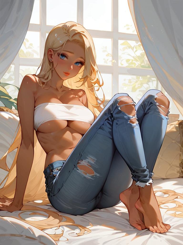 1girl, large brasts, underboob, wearing ultra-short bandeau crop top and high-waisted relaxed-fit ripped jeans in pastel yellow top with soft blue denim on medium-toned woman with dark sun-lightened hair posed leaning back with both hands behind her on the bench, face turned toward the sun in balcony corner with neutral railing and wall under backlit sunlight with subtle rim light on the hair, laid-back summer lifestyle fashion photography, high resolution, ultra-detailed