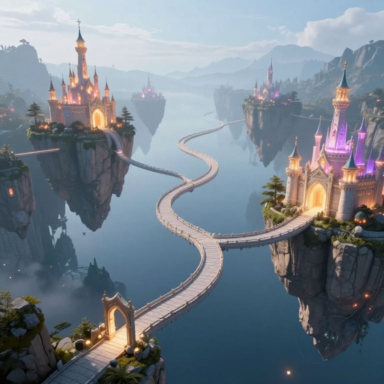 Fantastical CGI image of a winding, illuminated bridge connecting floating, fairy-tale-like castles on rocky islands over a calm, reflective lake.