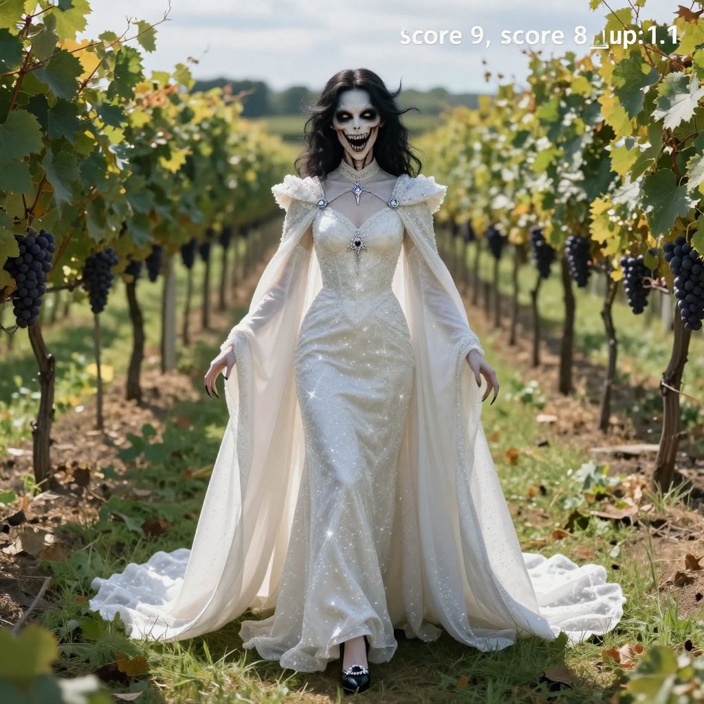 Cinematic, (score_8_up:1.5), (score_9, score_8_up:1.1), score_7_ up, zPDXL, 1 girl, young girl, petite, small breasts, Hana: Gashadokuro Necromancer, skeletal body, glowing eyes, dark magic aura, cruel laughter, malevolent spirit., she wear Flowing, starlight-white gown with intricate, sparkling patterns, high-necked, long-sleeved cloak with a silver clasp and gemstone accents, choker with a small, shining silver stardust pendant, high-heeled, black leather shoes with a silver buckle and gemstone accents. in claw pose, in A sunlit vineyard with rows of grapevines, masterpeice, 8k, ultraclear, wide angle, detailed faces, perfect quality, tranding on artstation, incredible details, detailed background, perfect body proportions, photorealistic