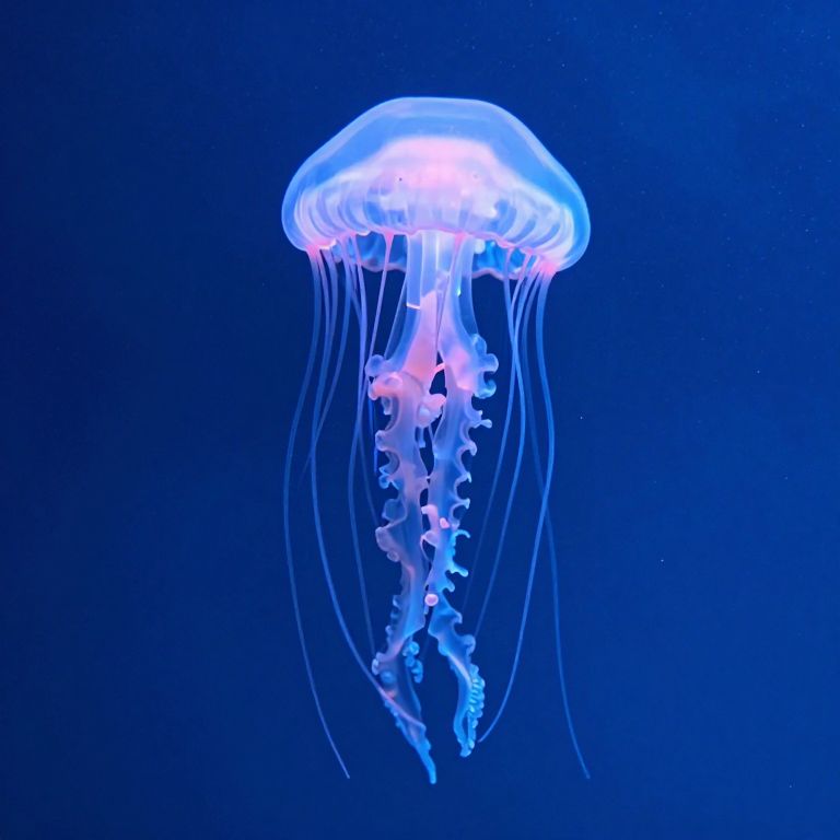 Photograph of a glowing, translucent jellyfish with delicate, flowing tentacles against a deep blue background, highlighting its ethereal, bioluminescent