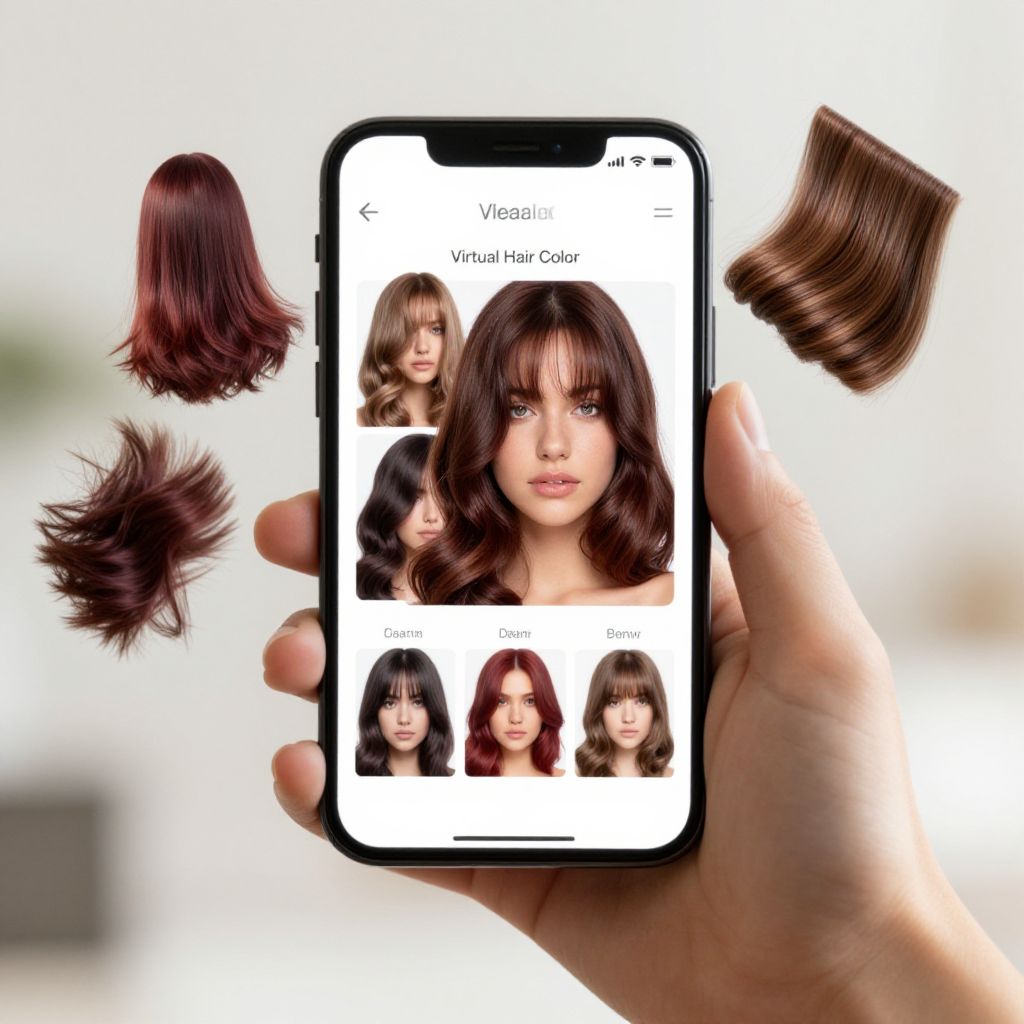 Virtual hair color tester app interface displayed on a smartphone held by a young adult, colorful hair swatches floating around in augmented reality, realistic skin tones, sleek UI design, natural light background, high detail cosmetic technology concept