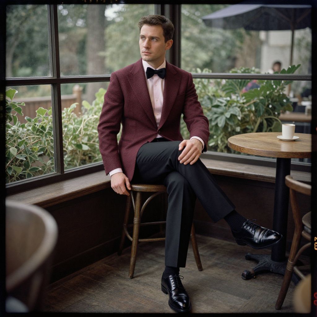 A man, burgundy textured dinner jacket, light pink dress shirt, black grosgrain bow tie, fitted black dress slacks, shiny black derby shoes, cozy coffee corner, large windows, greenery-filled terrace, daguerreotype film style, contemplative expression. Man has masculine face and piercing eyes