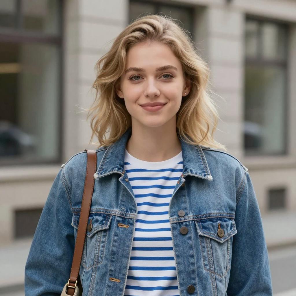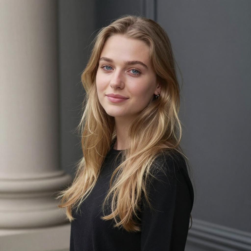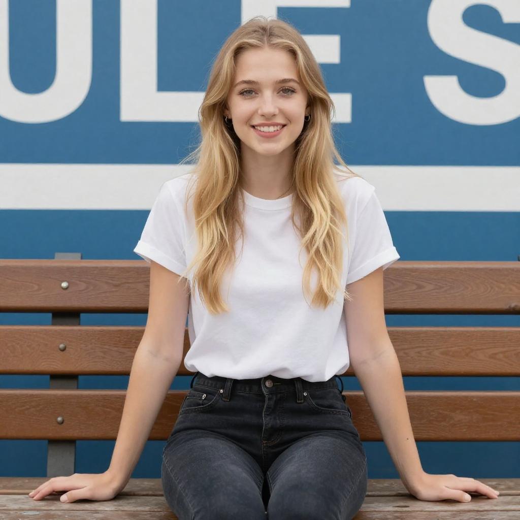 Photograph of a young woman with long blonde hair, fair skin, and a smile, sitting on a wooden bench. She wears a white t-shirt with black and blue jeans. Her hands rest on the bench, and she looks directly at the camera. The background features a blue wall with white and s.