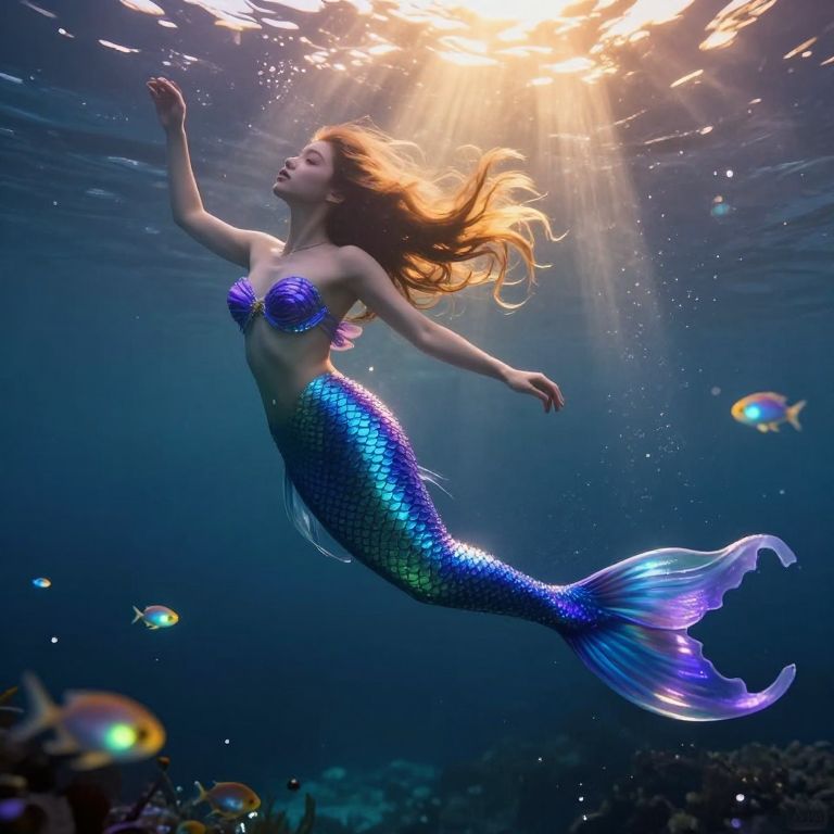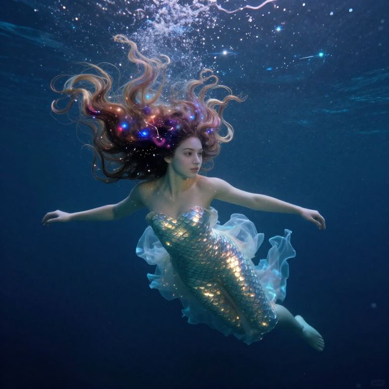 An ethereal portrait of a celestial nymph with shimmering scales reflecting starlight, her cascading locks swirling with cosmic colors depicting constellations. From an unconventional underwater vantage point, she floats gracefully amidst a sea of glistening nebulae, bathed in the gentle luminescence of faraway star clusters. Her captivating gaze invites viewers into this fantastical realm where aquatic serenity merges with cosmic enigmas, evoking a sense of tranquility and marvel reminiscent of surrealistic artistry.