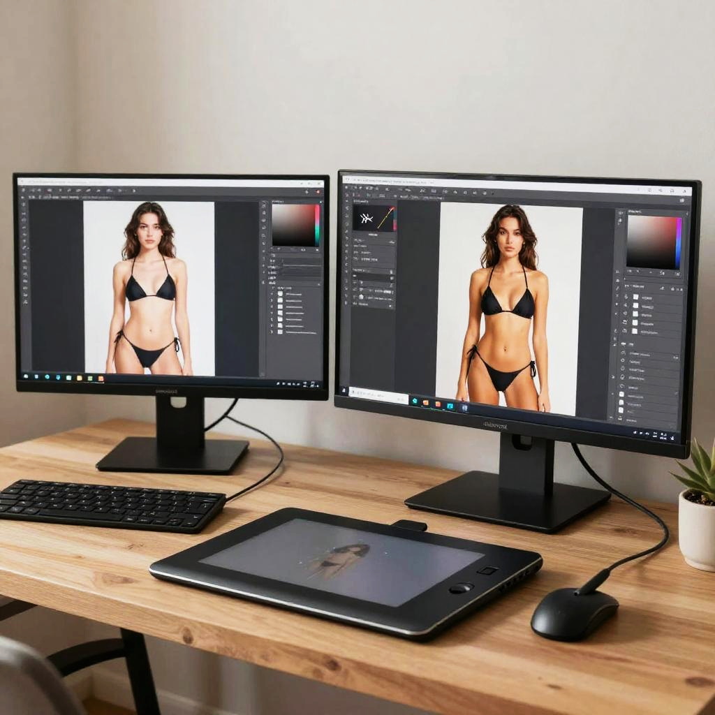 Hires fix theme illustrating an artist's workspace with high-resolution photo editing tools, multiple monitors showing before and after image restoration, soft natural lighting, photo retouching brushes and color correction interface, cozy and creative atmosphere with intricate textures