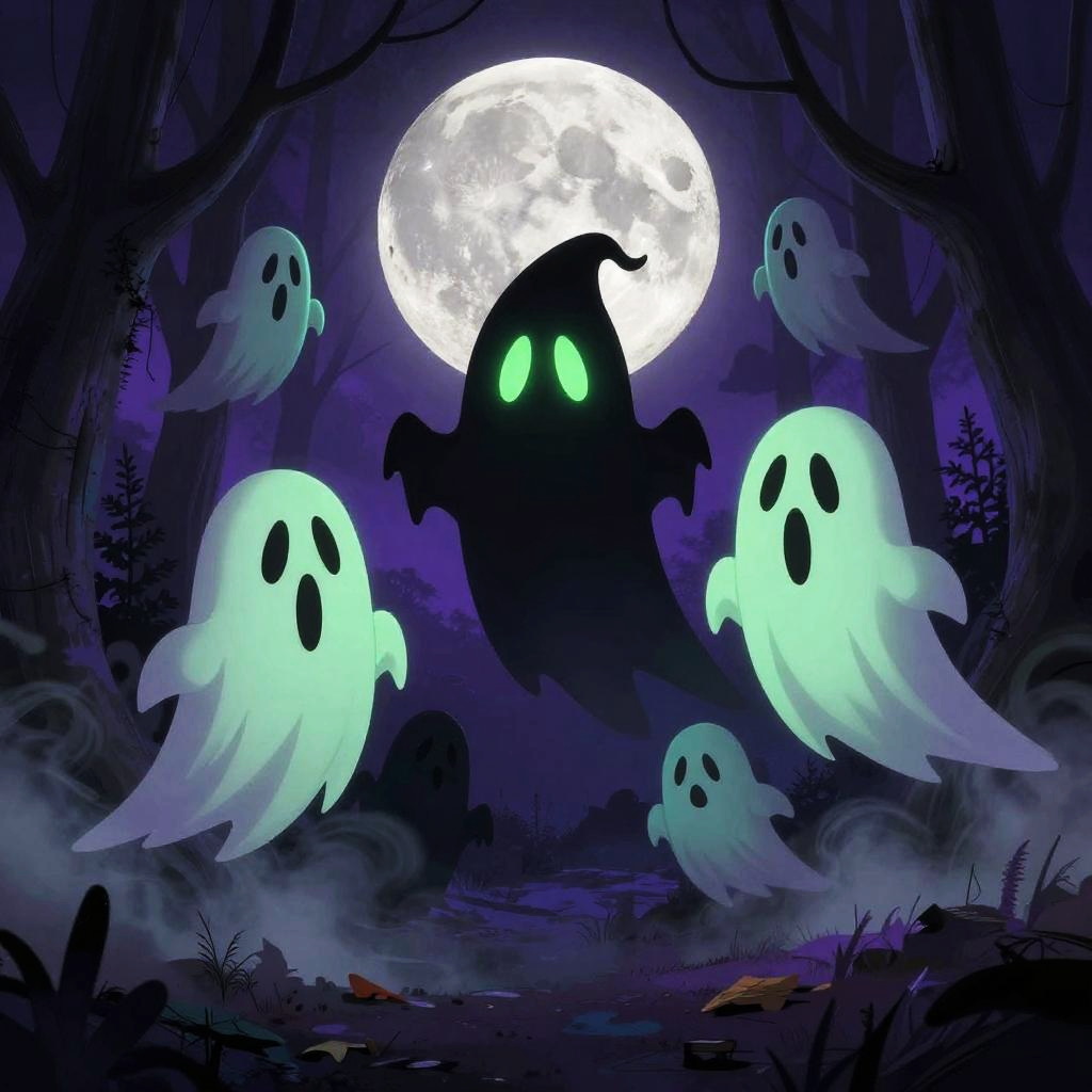 Spooky cartoon characters haunting an eerie moonlit forest, exaggerated expressive faces with glowing eyes, whimsical ghostly shapes floating, vibrant but dark color palette with purples and greens, dark mist rolling on the ground, vintage Halloween vibe