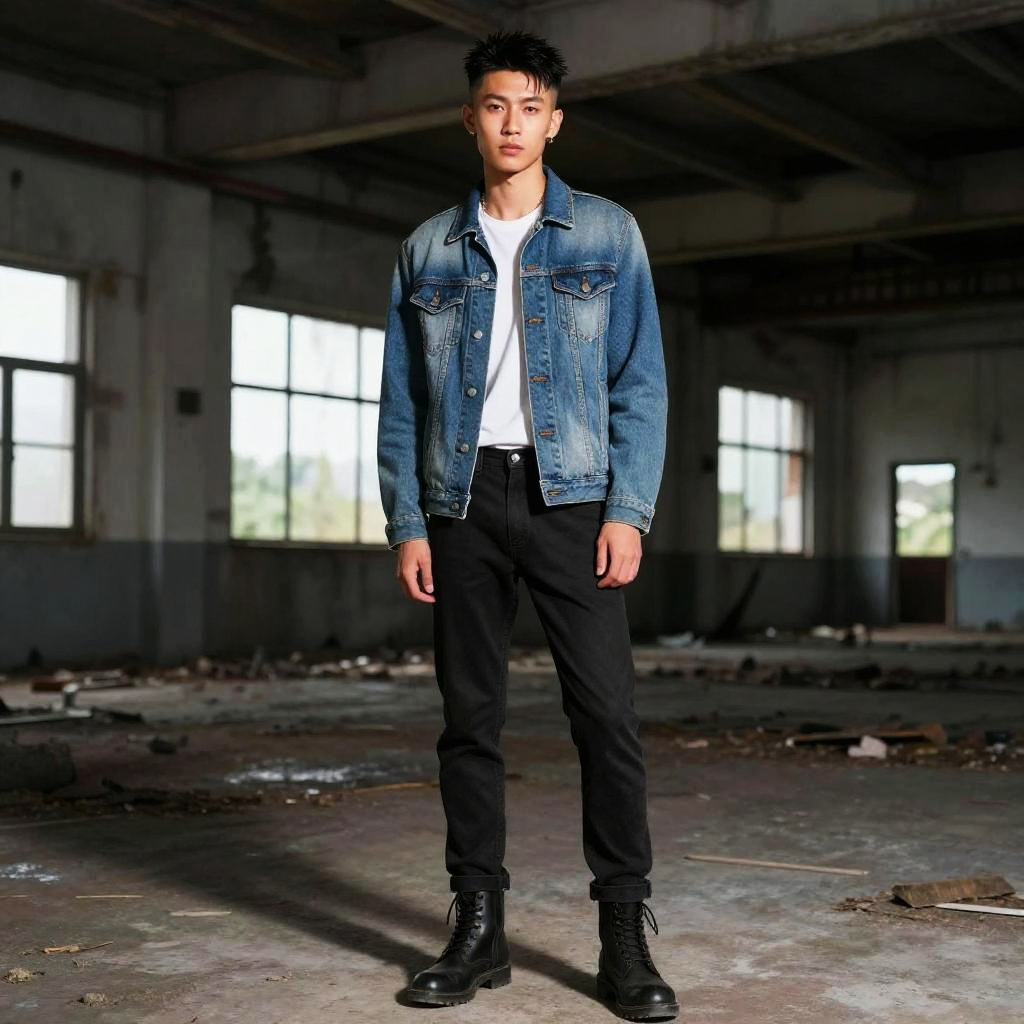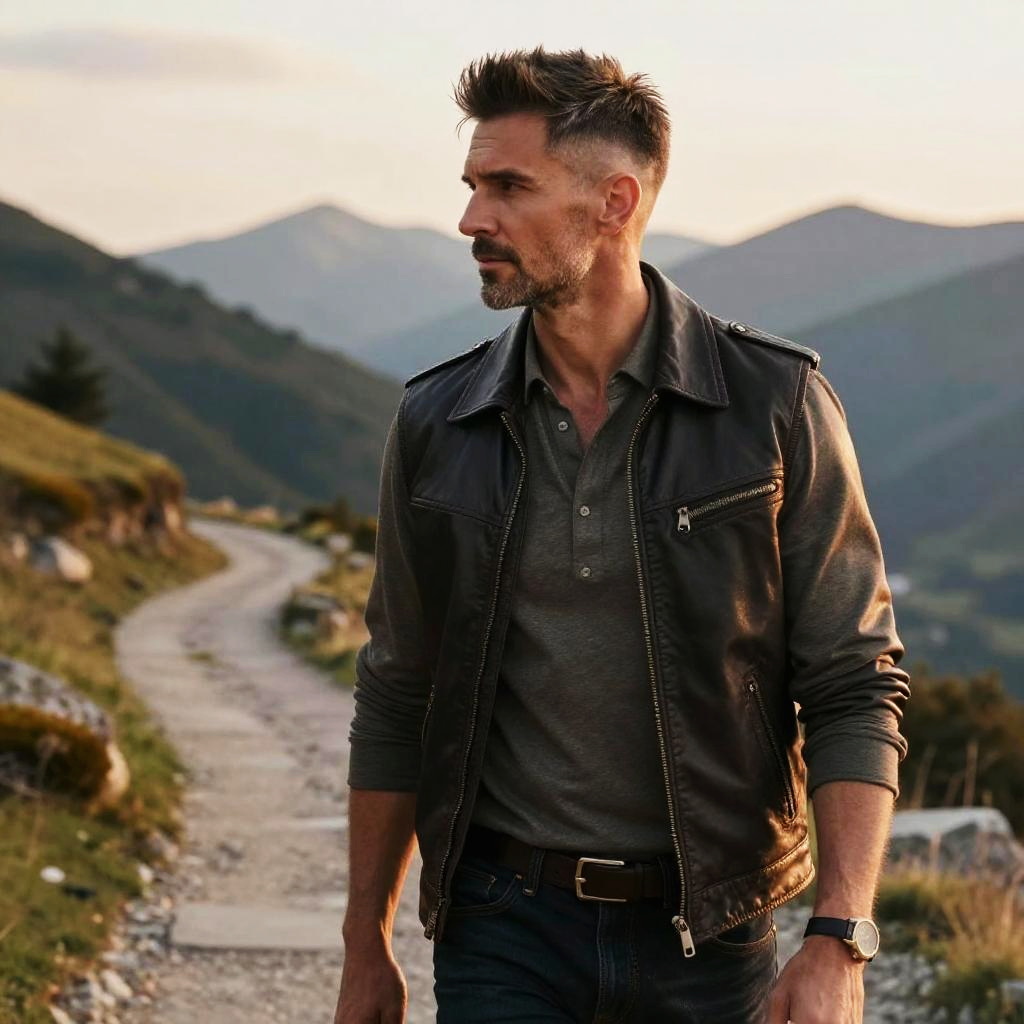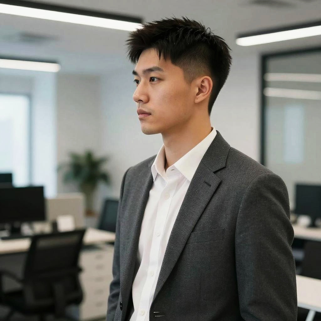 Drop Fade hairstyle on male dancer, wearing form-fitting performance wear, in theater stage, captured in fashion editorial style with spotlight focus.