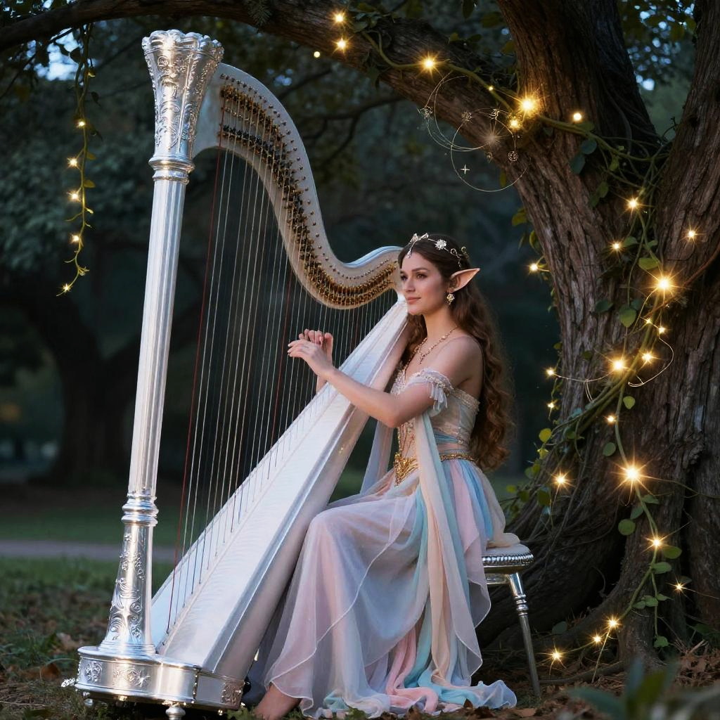 Elegant Elf Bard Playing Silver Harp