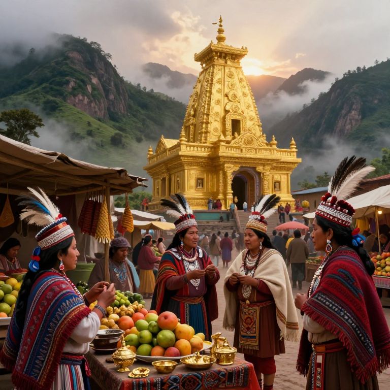 Craft an image reminiscent of digital paintings by Michael Kutsche, portraying a lively marketplace scene inspired by ancient Incan civilization. The focal point is a magnificent golden temple with intricate design, situated against verdant Andean mountains veiled in mist. As dawn light touches the temple's spires, it radiates an otherworldly glow over market stalls laden with vivid fruits, luxurious textiles, and resplendent gold artifacts. Amidst this bustling atmosphere, indigenous people clad in traditional attire - featuring regal feather headdresses, finely woven capes, and exquisite jewelry - engage in spirited exchanges as merchants showcase their wares. The artwork harmoniously fuses hyper-realistic details with an aura of mystique, capturing the ancient culture's deep reverence for nature while integrating Kutsche-like blend of fantasy and historical elements into a captivating panorama.