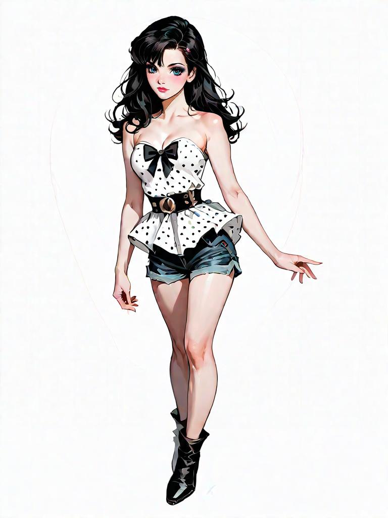 1girl, source_comics, realistic face, full body shot, Woman, retro-inspired, black and white polka dot playsuit, strapless with a sweetheart neckline, front tie under the bust creating a keyhole cut-out, high-waisted shorts, fitted silhouette, plain white background.