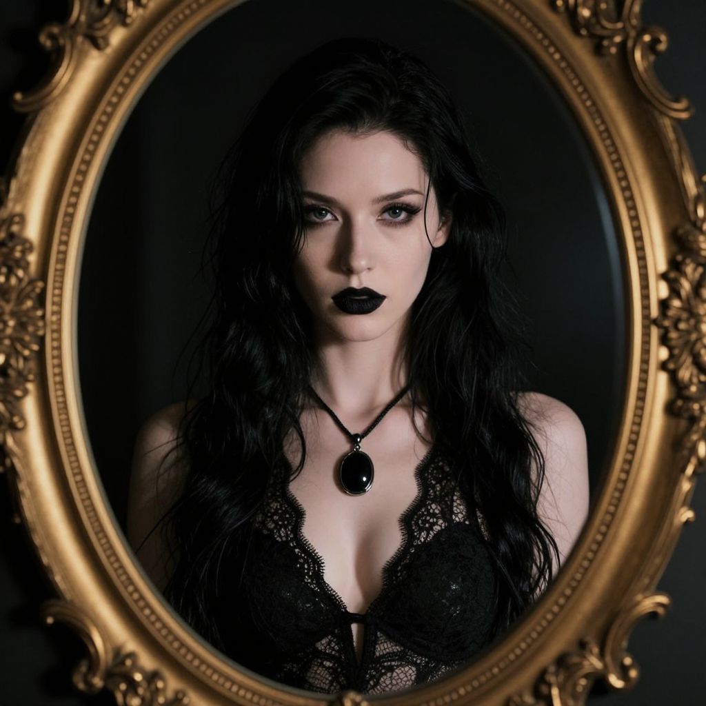 A digital portrait of a pale-skinned woman with long, dark, wavy hair, wearing a low-cut black lace top that reveals a hint of cleavage. She has intense, dark eyes and full lips, adorned with a black pendant necklace. She's framed by an ornate, gold-trimmed oval mirror with a dark, mysterious background. The lighting is dramatic, highlighting her face and creating shadows.