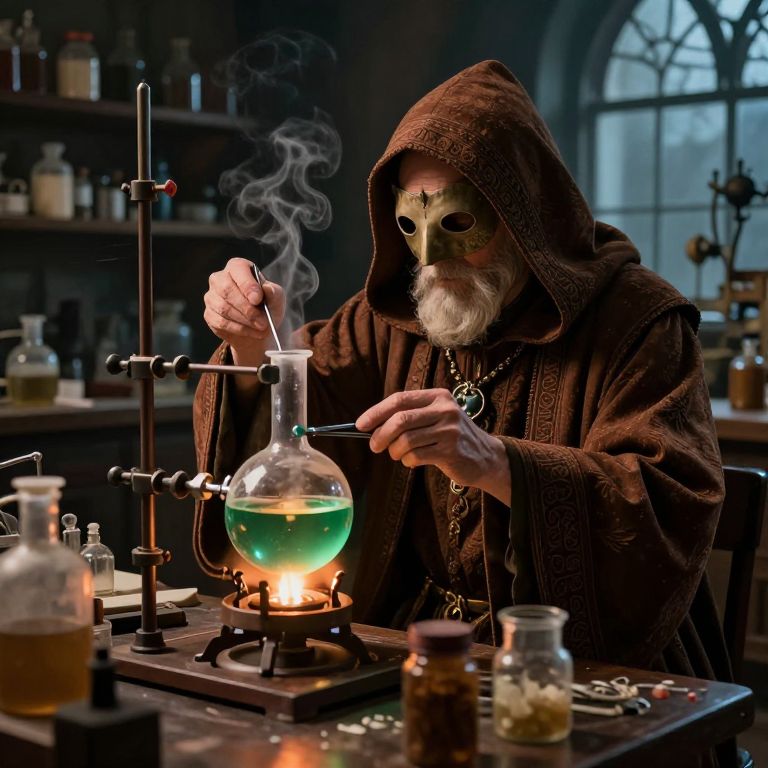 In a dimly lit lab, an elderly, hooded alchemist, adorned with a mask and a necklace, is engrossed in a dangerous experiment. The alchemist, dressed in a rich, brown robe with intricate patterns, is seated at a cluttered table filled with various apparatuses and containers. A large, steaming flask, filled with a green liquid and surrounded by a network of pipes and burners, dominates the scene. The alchemist's hands, deftly manipulating a pair of tongs, hover over the flask, suggesting the delicate nature of the experiment. The background reveals shelves lined with more containers and equipment, hinting at the extensive nature of the alchemist's work. The interplay of light and shadow, created by the window in the background, casts dramatic highlights and shadows, enhancing the sense of depth and texture in the scene.