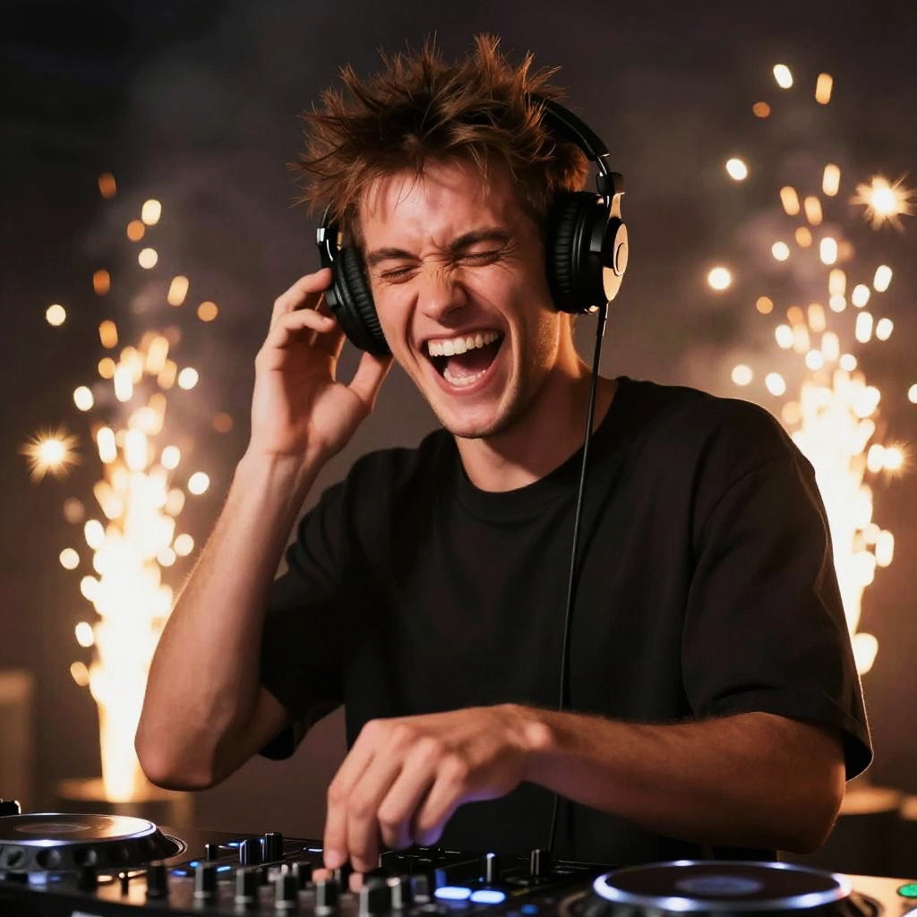 Energetic DJ Laughing with Mixer