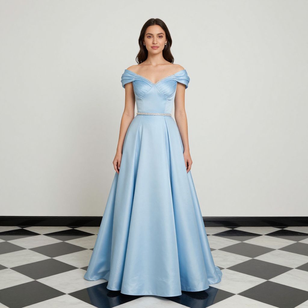 Blue Princess Dress, a woman in a blue dress standing in a room with a black and white floor