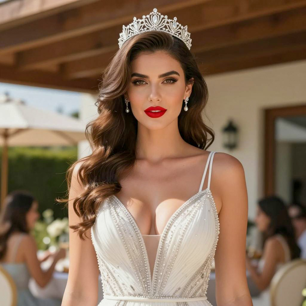 Digital illustration of a fair-skinned woman with blue eyes, wearing a turquoise wide-brimmed hat adorned with lace and a large bow. She has dark brown, wavy hair, and wears a strapless turquoise dress with intricate lace patterns over the bust. She has large, elaborate, diamond-shaped earrings. Her expression is calm and direct. Background is blurred with vertical stripes. Her arms are slightly raised, showing her collarbones. She is the only person in the image.