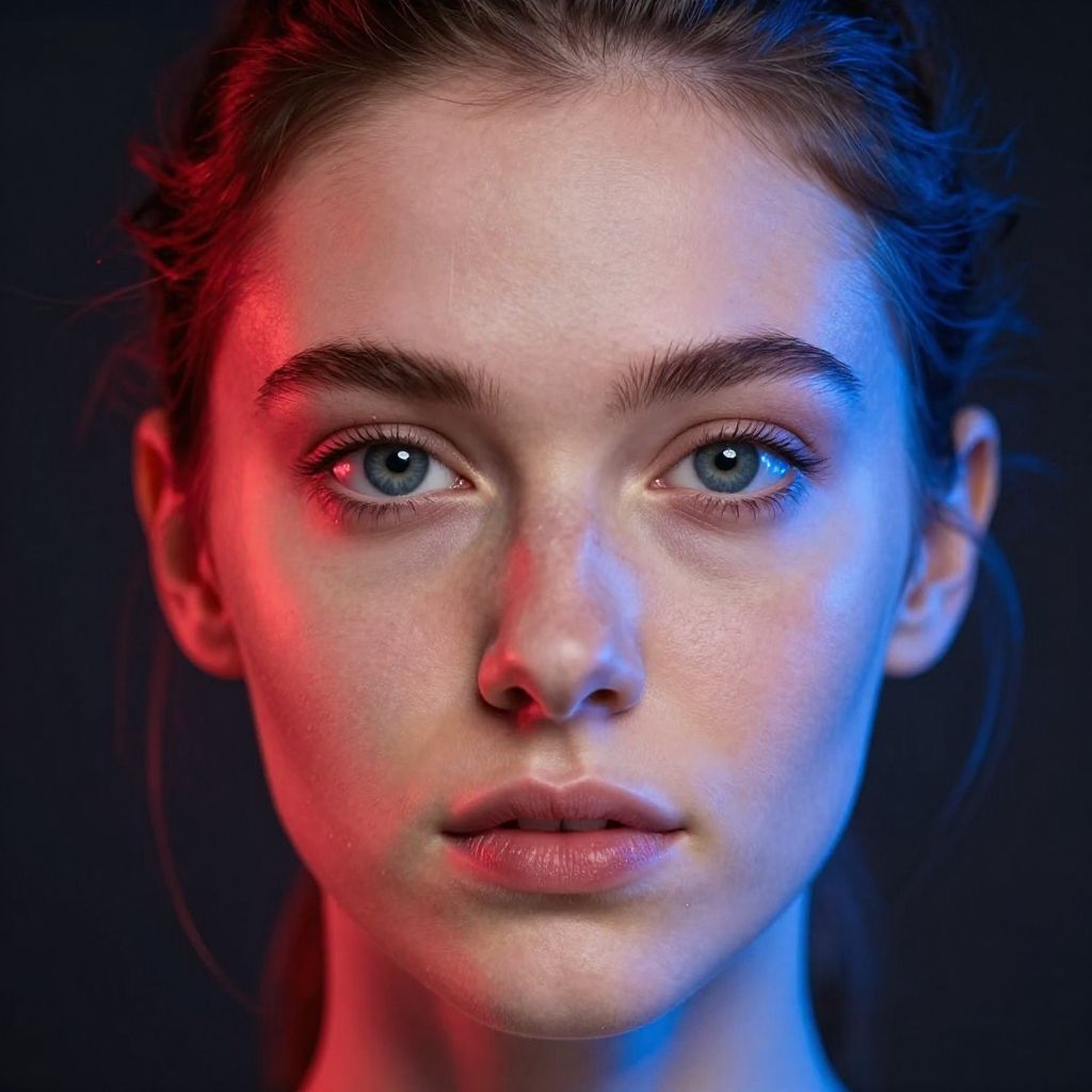 DEN_violetta_NJ(headshot:1.2) portrait on a (plain dark background:1.2), (headshot:1.2), (face focus:1.1), intricate (beautiful eyes:1.2), (wide open eyes:1.1), Big eyes, clean photo, lighting from behind, (Red lighting from the left:1.3), (Blue lighting from the right:1.3), bokeh, f1.4, 40mm, photorealistic, raw, 8k, textured skin, skin pores