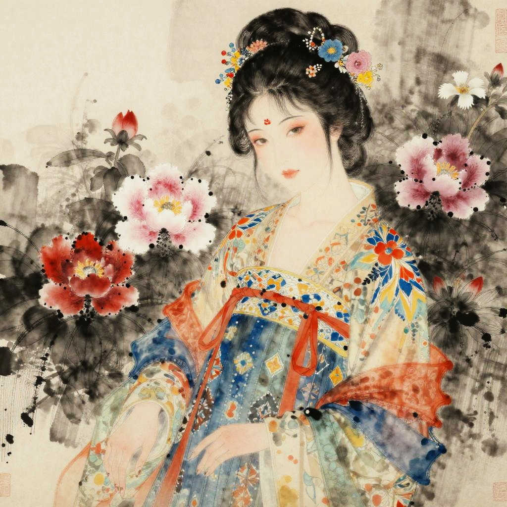 Elegant Woman in Hanfu with Flowers Ink Painting