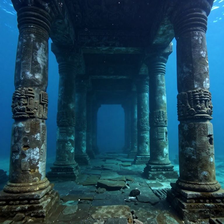 An ancient, sunken temple of colossal stone pillars stretches endlessly beneath the ocean's surface, its weathered columns bathed in ethereal light filtering through the depths, creating a hauntingly serene yet otherworldly realm.
