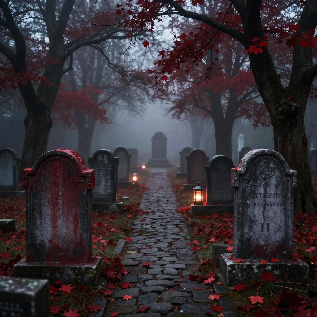 Red graveyard aesthetic featuring weathered gravestones stained with deep red hues, surrounded by twisted trees with blood-red leaves, soft glowing lanterns amid thick fog, cracked cobblestone paths leading into darkness, evoking somber and mystical vibes.