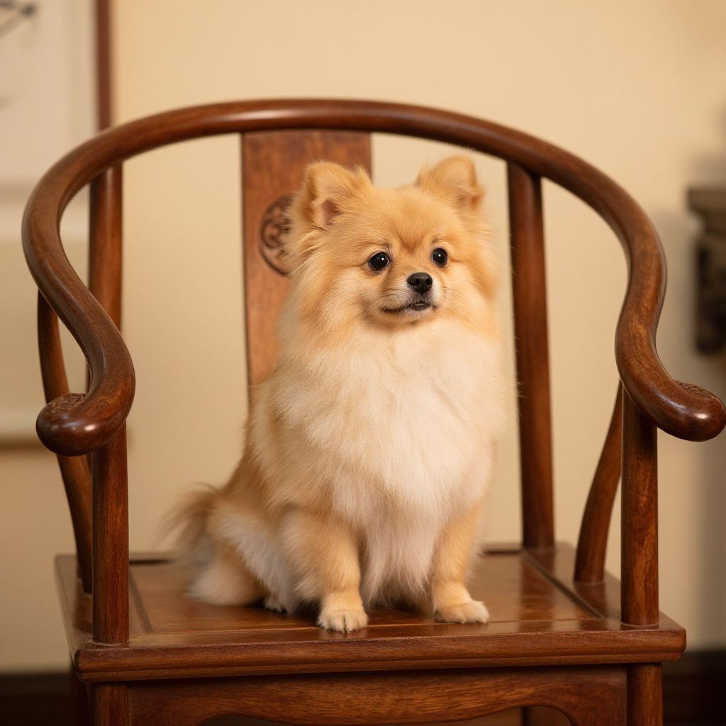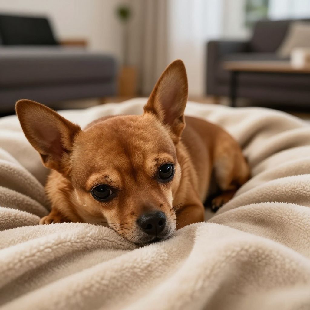 Brown and black chihuahua wearing a cute red collar, sitting on vintage leather armchair in a cozy library, atmospheric warm light, photorealistic details, elegant and charming mood