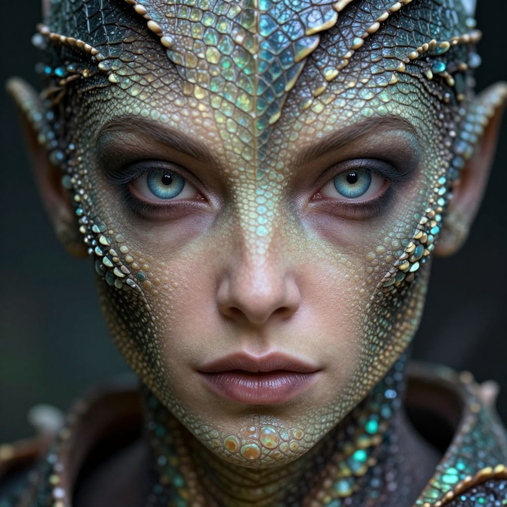 A close-up portrait reveals an enigmatic figure with piercing sapphire eyes and iridescent scales adorning their skin. Their expression exudes a blend of wisdom and mischief as they transform from human to reptilian form, the face split evenly between human features and scaled hide. This hyper-realistic image, captured from above, showcases the mesmerizing interplay of these two forms. Soft ambient light gently illuminates their skin, highlighting every texture and scale detail while seamlessly blending into the organic curves of their remaining human features.