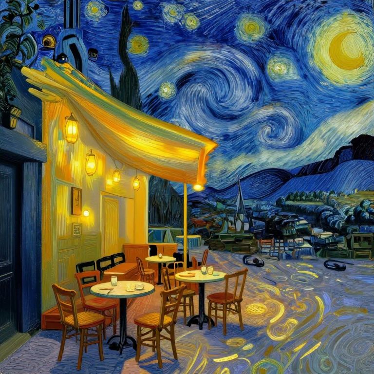 This digital artwork, inspired by Vincent van Gogh's "Starry Night," depicts a vibrant outdoor café at night. The scene features a bright yellow awning with glowing lanterns, illuminating wooden chairs and small round tables on a cobblestone patio. The sky is swirling with bold, deep blues and vibrant yellows, resembling Van Gogh's iconic starry night motif. In the background, silhouetted trees and distant buildings add depth, while the swirling patterns on the ground mirror the sky's dynamic energy. The overall style combines Van Gogh's expressive brushstrokes with digital color intensity, creating a surreal, yet recognizable scene.