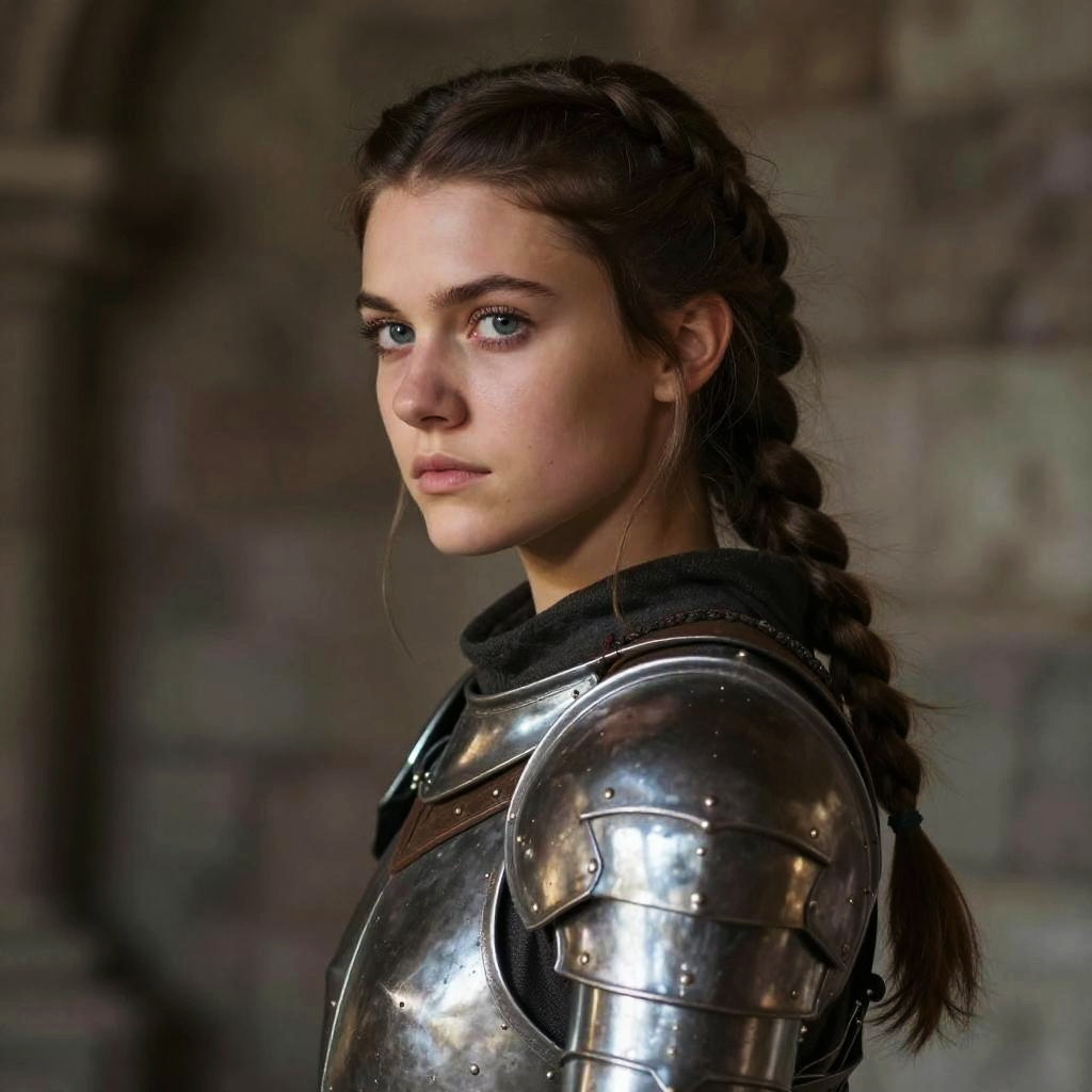 Photograph of a young woman with fair skin and brown hair in a braid, wearing shiny, reflective medieval armor. She has a serious expression, with light brown eyes looking slightly to the side. The background is a blurred, dark stone wall, suggesting an ancient castle or fortress. The armor is made of polished steel plates, and she is wearing a dark, likely woolen, garment underneath. The lighting is dim, highlighting her face and armor while casting soft shadows. The overall mood is solemn and heroic.