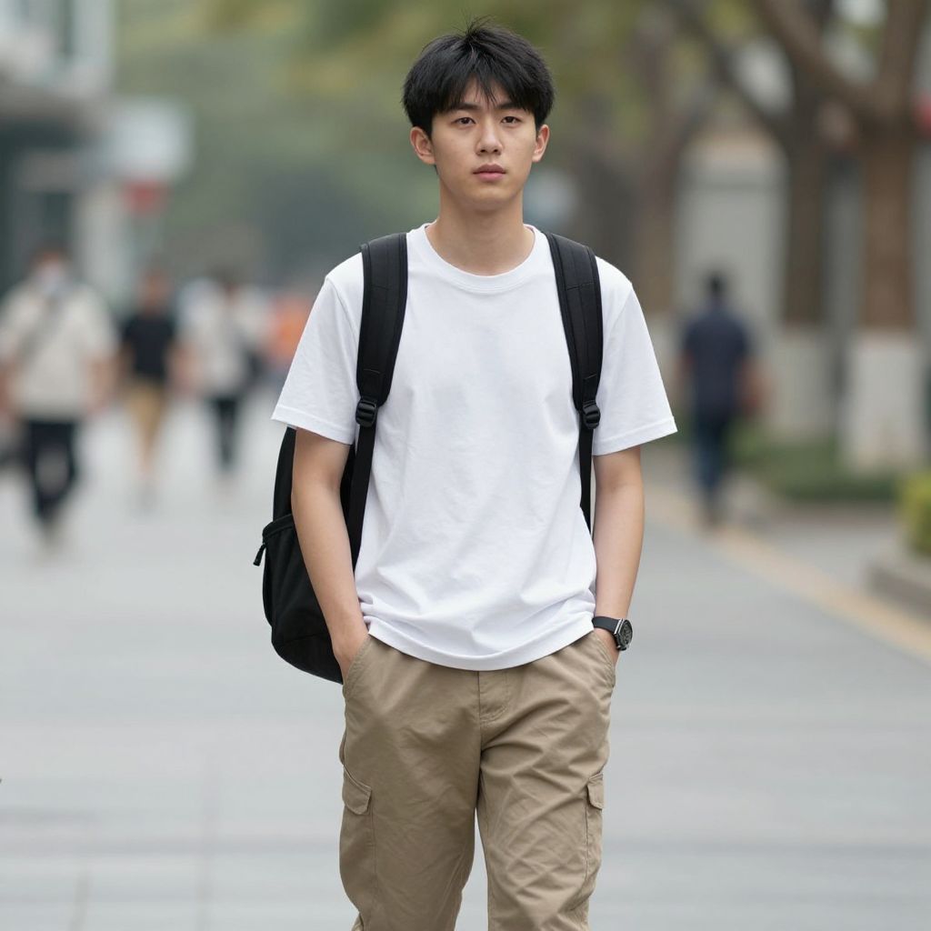 Casual interview outfit male, 1boy, male focus, solo, pants, hands in pockets, backpack, bag, shirt, blurry background, outdoors, blurry, black hair, standing