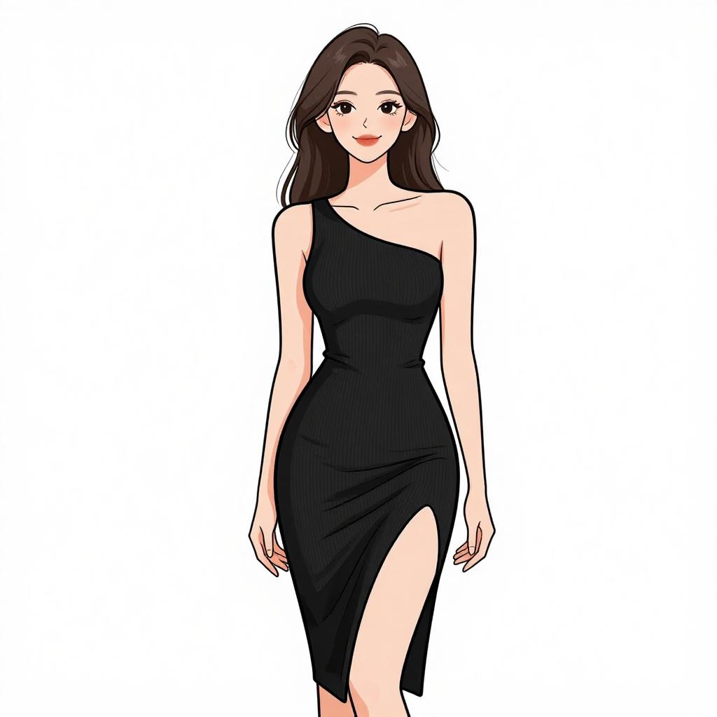 Digital illustration of a smiling young woman with long brown hair, wearing a tight black sleeveless dress, large hoop earrings, standing in a brightly lit,