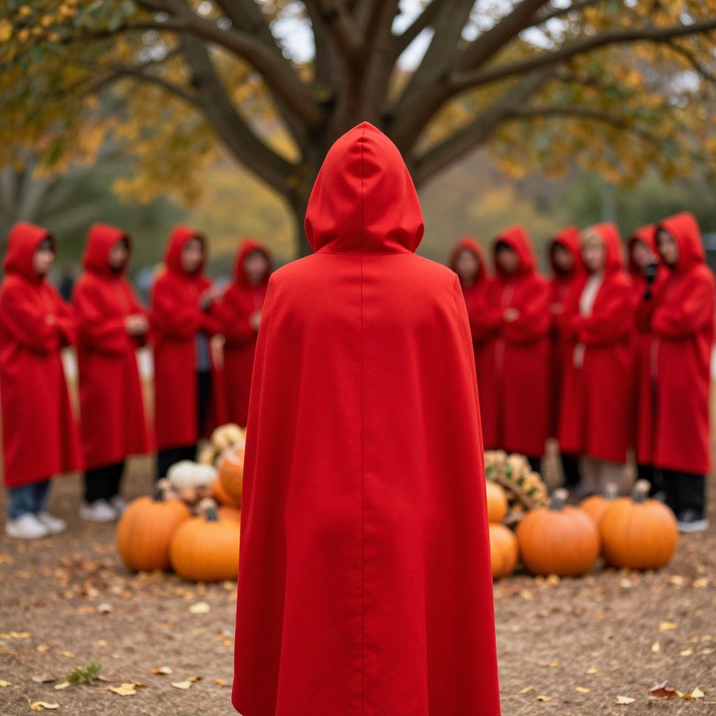 A person in a red costume with a hood is standing in front of a group of people in red costumes. There are pumpkins on the ground and a tree in the background.