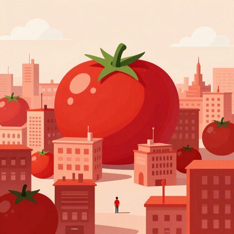 The image presents a surreal, vector illustration by Jon Klassen, featuring a landscape of tomato-shaped buildings. The scene is dominated by a large, vibrant red tomato at the center, with a small green sprout on top, suggesting growth or life. Surrounding this tomato are numerous smaller tomato-shaped structures, creating a cityscape. The buildings are arranged in a circular pattern, with varying heights and architectural styles, giving the impression of a bustling urban environment. The color palette is primarily warm, with shades of red and orange, creating a cohesive and harmonious visual effect. The sky is a soft, light beige, with a few scattered clouds, adding depth to the scene. In the foreground, a tiny figure in a red shirt stands, providing a sense of scale and emphasizing the giant tomato's size. The overall composition is balanced, with the tomato and the cityscape evenly distributed across the frame, creating a sense of harmony and wonder.