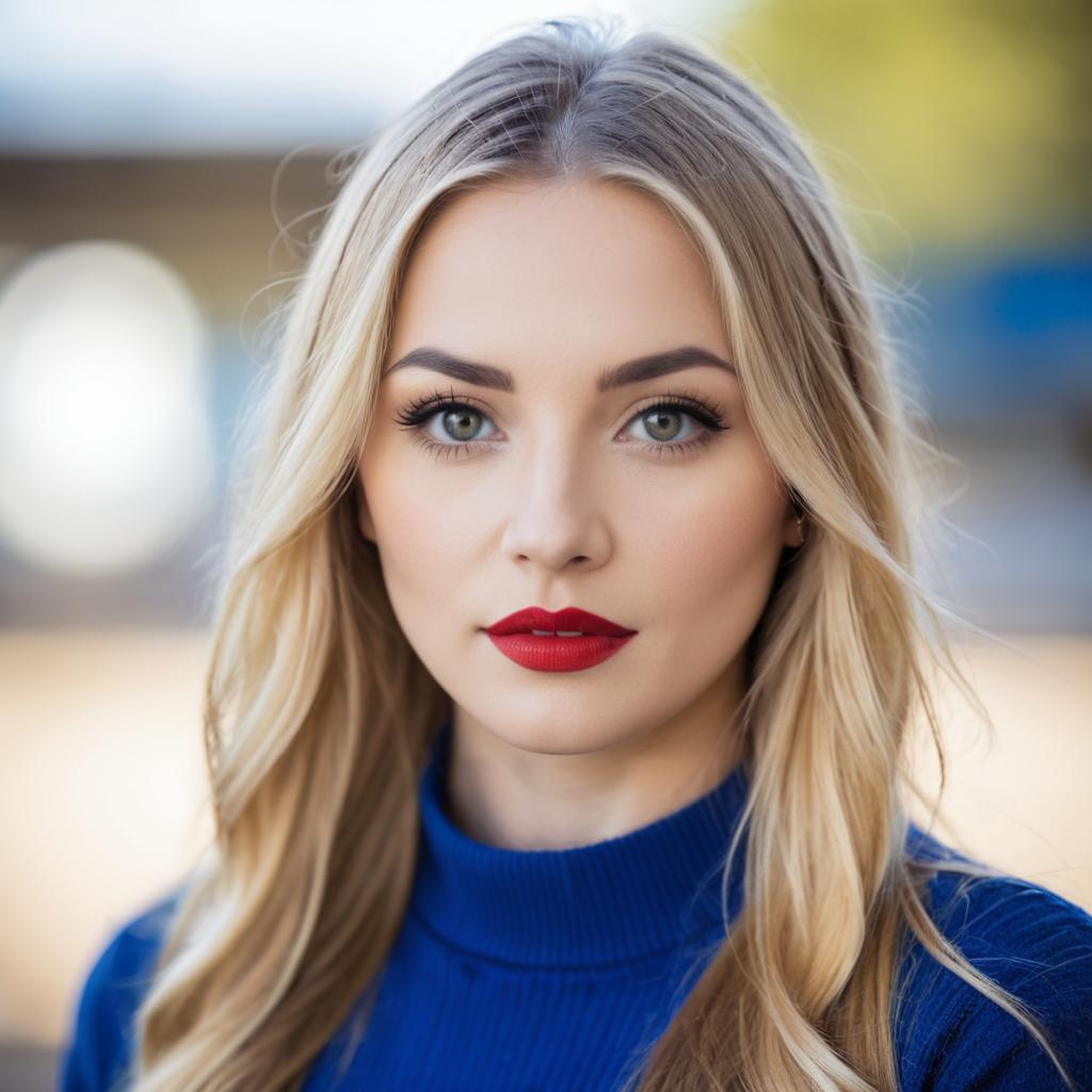 1girl, solo, blonde hair, realistic, long hair, looking at viewer, lips, photorealistic, blurry, blurry background, upper body, closed mouth, red lips, nose, black eyes, makeup, blue eyes, depth of field