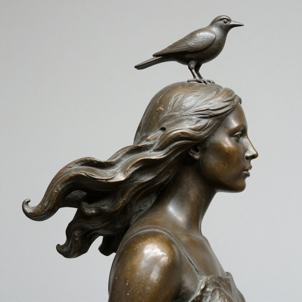 Photograph of a bronze sculpture depicting a side profile of a young woman with flowing hair, topped by a perched bird. The woman's face is serene, with detailed hair cascading in gentle waves. The bird, with a sleek, streamlined body, stands confidently on her head. The sculpture has a polished, dark bronze finish, contrasting with a plain, light gray background. The composition emphasizes the delicate balance between the human and avian elements, highlighting the sculpture's intricate textures and fine details.