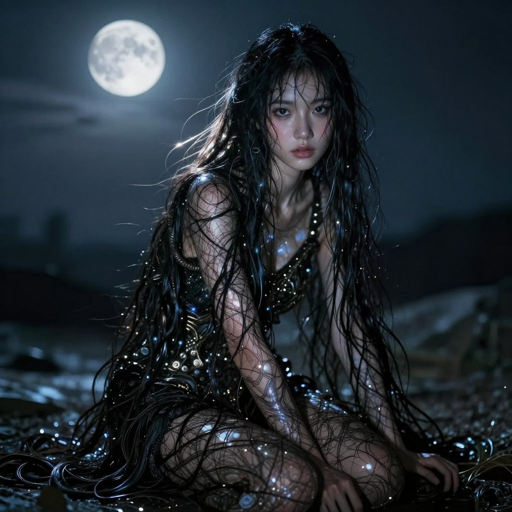 Photograph-style digital artwork of a young woman with long, wet, black hair cascading over her pale, delicate skin. She sits on a dark, wet surface under a bright full moon, which illuminates her with a blue and silver glow. Her expression is intense and slightly melancholic, with dark, piercing eyes and full lips. She wears a beaded, shimmering, black outfit that clings to her slim, lithe physique. The background is a blurred, dark night sky with silhouetted hills. The overall tone is dark and mystical, with a focus on the moonlight reflecting off her hair and beads.