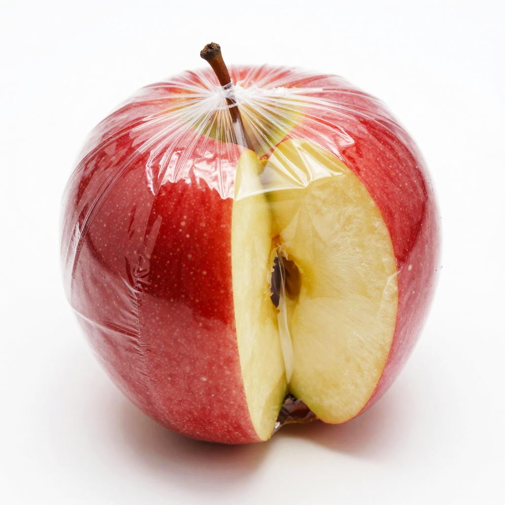 This close-up photo features a bright yellow apple wrapped in a crinkled, shiny red plastic wrap. The apple is positioned at an angle, with the wrap's edges slightly peeled back, revealing a bit of the apple's surface. The background is a stark white, making the colors of the apple and wrap pop. The image has a glossy texture, emphasizing the plastic wrap's crinkles and the apple's smooth skin.