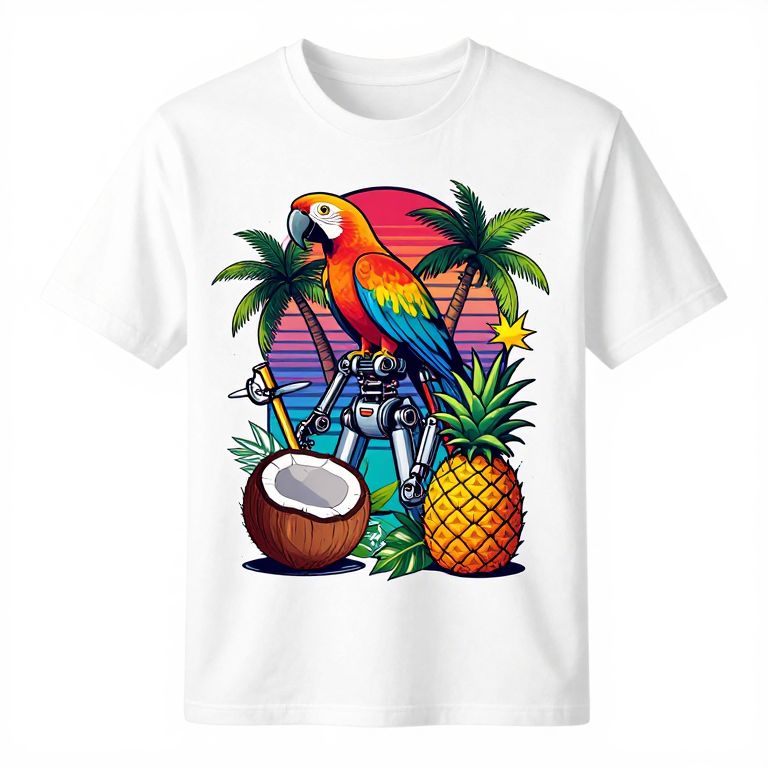 Cyborg concept design for a tshirt themed with 80s tropical style, parrot, coconut, pineapple, high detailed, mockup, 8k, vector format, no words, clear lines,
