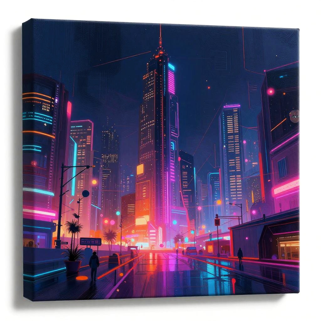 Image into AI art transformation, a surreal blend of abstract digital brush strokes and vibrant neon colors, futuristic cityscape background, high detail, dynamic composition, glowing elements, cyberpunk aesthetic, canvas style