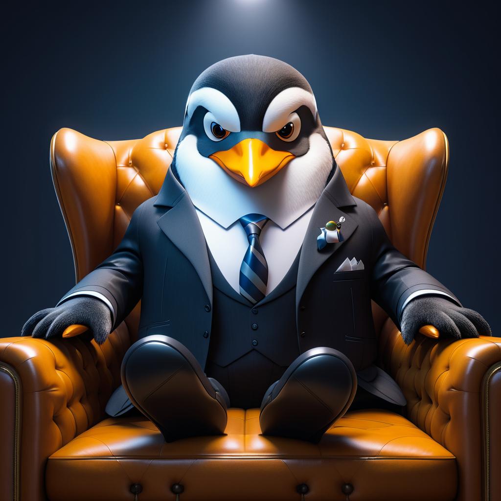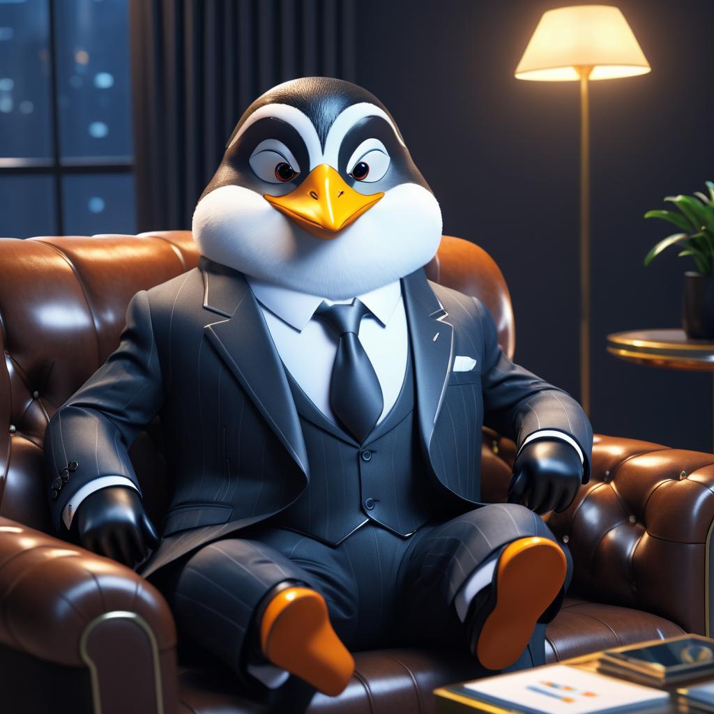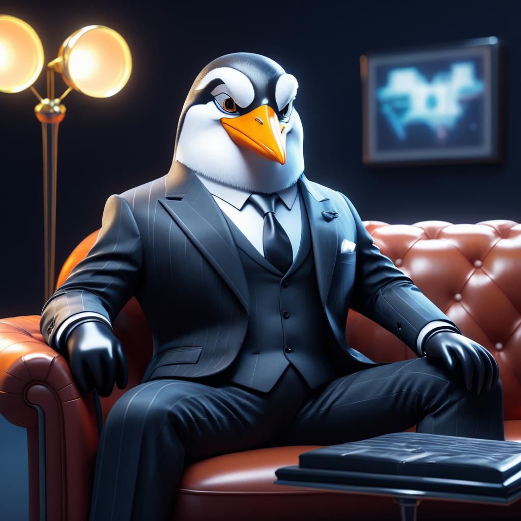 Anthropomorphic penguin in a suit doing business on a detailed couch. Studio lighting, 8K resolution, trending on ArtStation, video game art style.