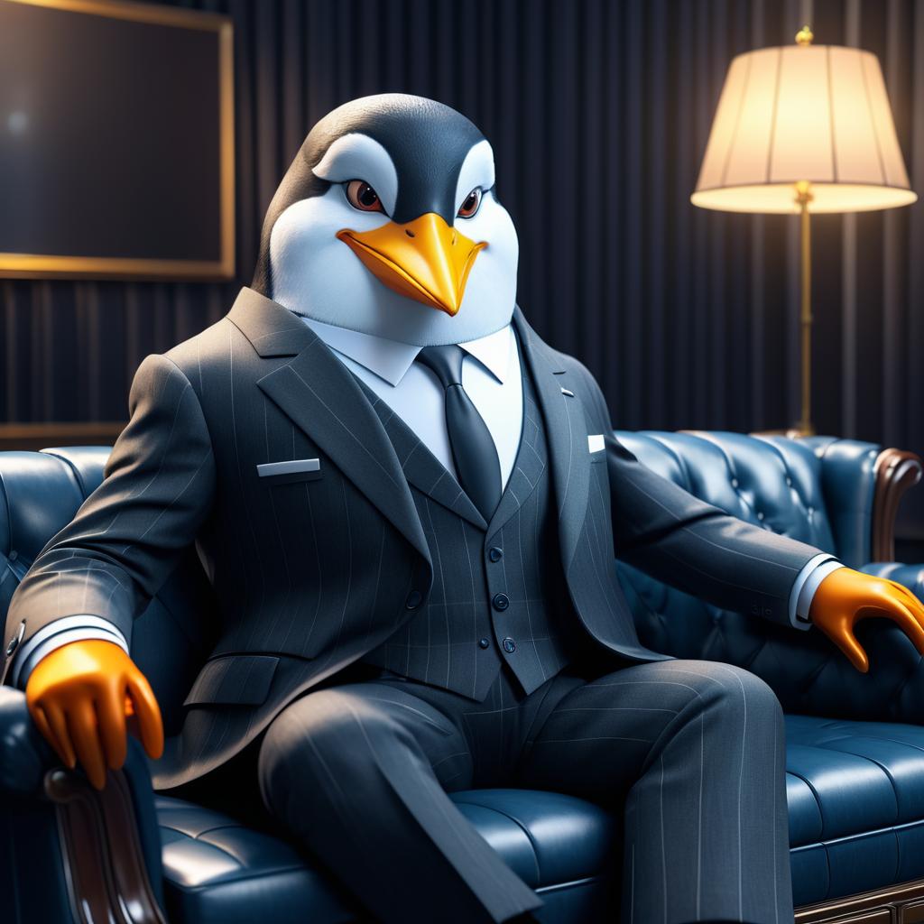 High-resolution digital artwork of an anthropomorphic penguin dressed in a pinstripe business suit, seated confidently on a tufted leather couch. The penguin character has a detailed face with expressive eyes and an orange beak, wearing a three-piece suit with a tie and pocket square. The setting features studio lighting with a lamp and blurred modern artwork in the background. The image is rendered in a video game art style with sharp, vivid details.
