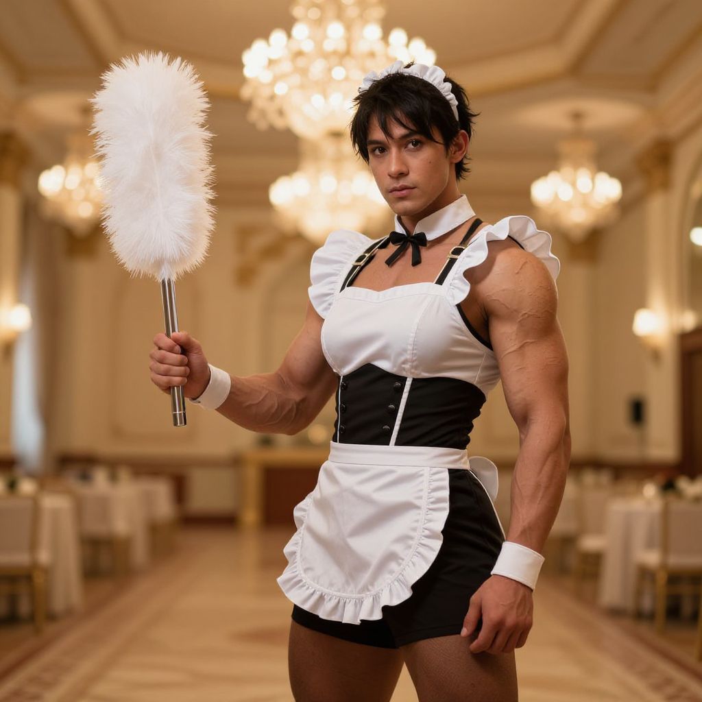 Muscle maid cleaning a grand ballroom, showcasing ripped muscles while holding a feather duster, futuristic maid costume blending traditional and athletic wear, soft glowing chandeliers illuminating the scene, photorealistic detail on skin and fabric textures.