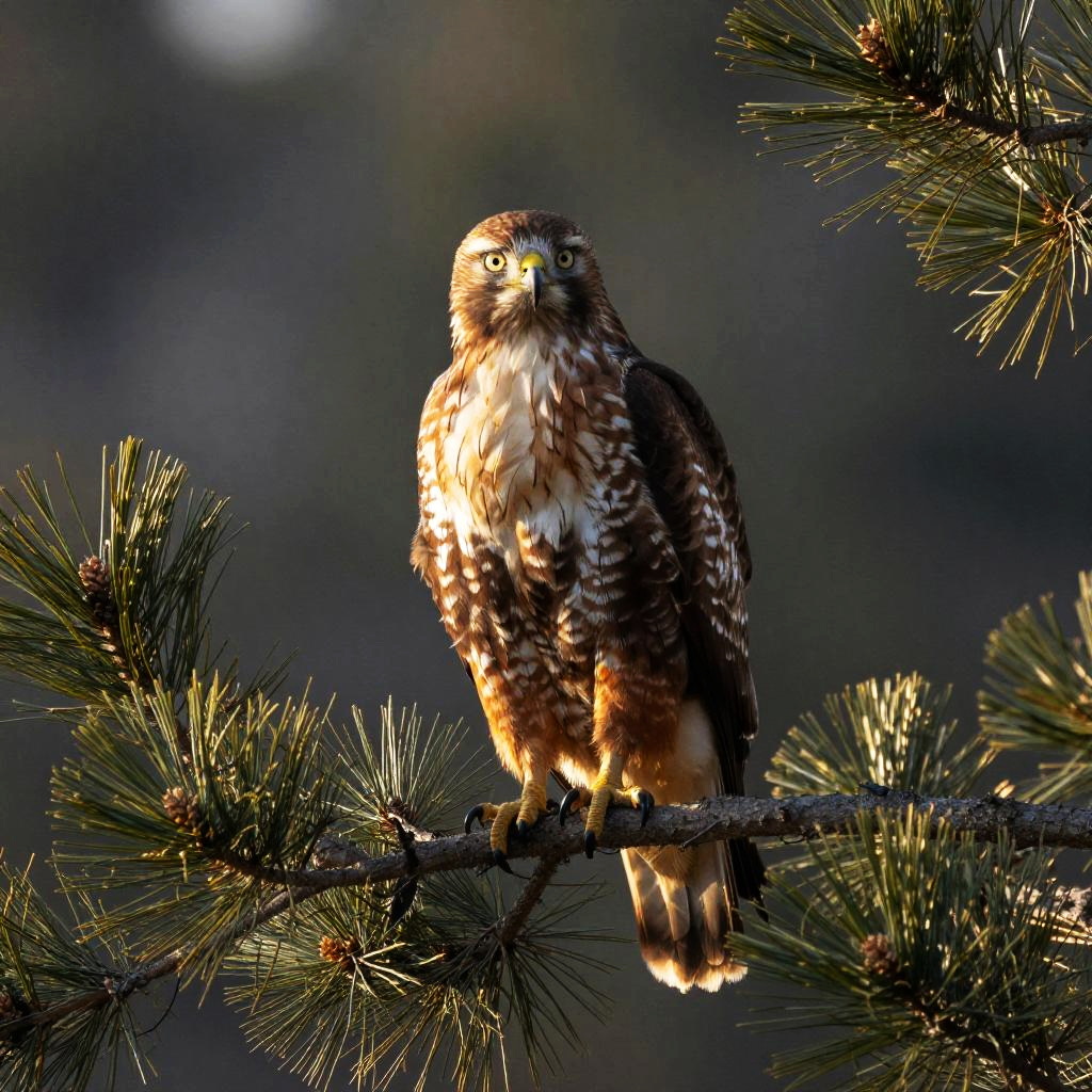Alert red-tailed hawk perched on pine branch on sun-dappled coniferous forest clearing, in crisp wildlife telephoto shot; heroic stance, warm rim light, detailed textures and fine fur/skin, expressive eyes, atmospheric perspective, low-angle dramatic view, leading lines, balanced rule-of-thirds composition, soft background separation, high dynamic range feel, ultra sharp subject, natural color grade, subtle haze, microcontrast on edges, immersive realism, SDXL, 8k resolution