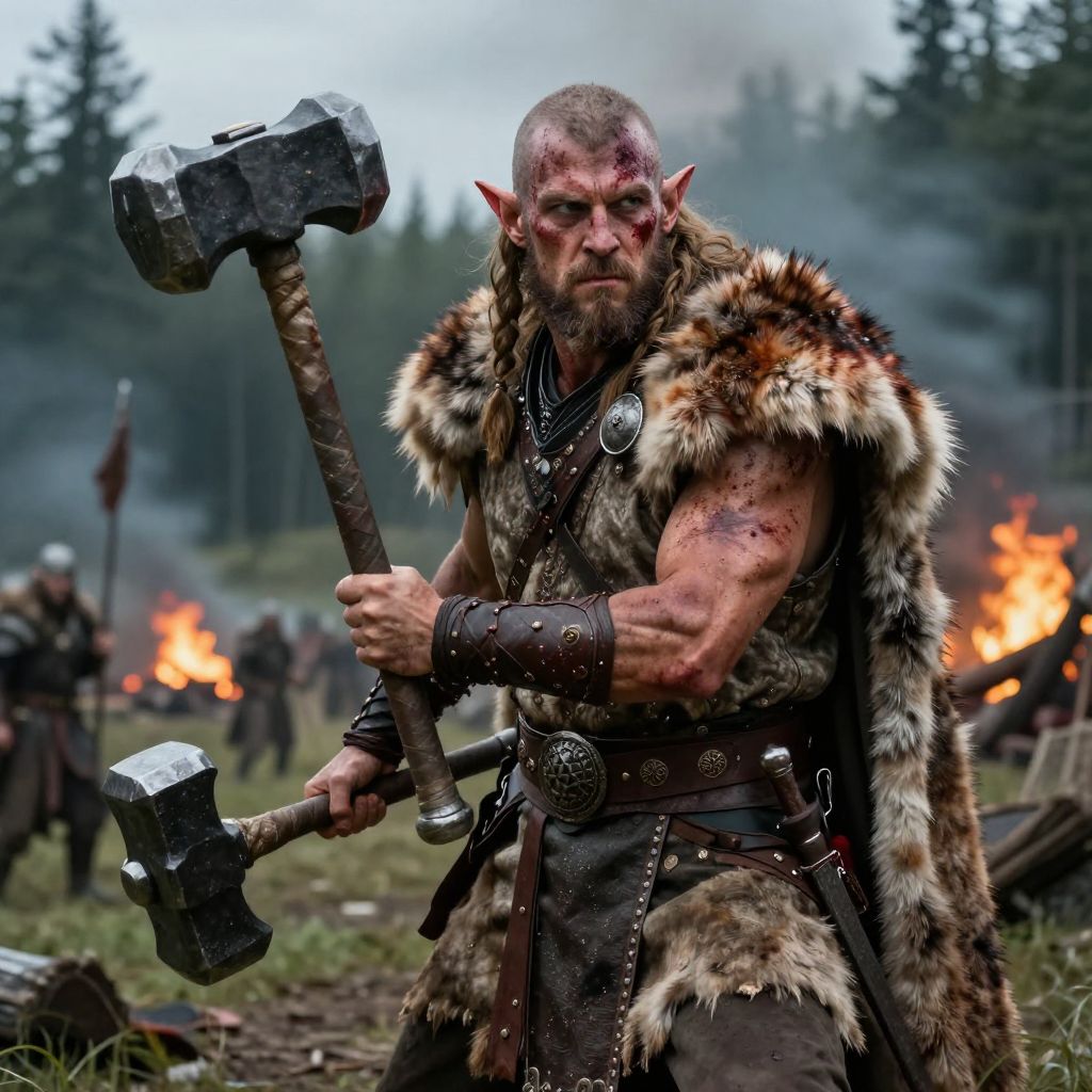 Elven barbarian in ancient battlefield, blood-streaked and determined, wearing a fur cloak over light armor, wielding a heavy hammer, wild forest and burning village in distant background